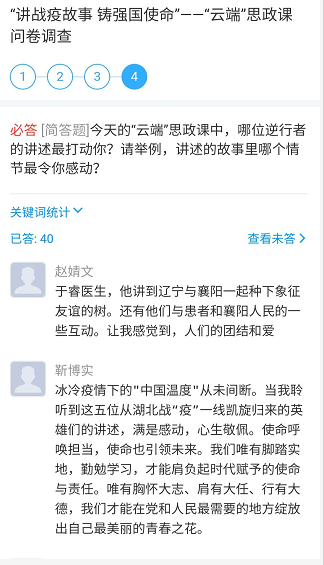 这堂生动感人的“云端”思政课,在我校师生中引起强烈反响。师生代表积极参与研讨本次思政课所传达的精神品质,他们深入学习研讨“抗疫”精神,深刻感悟“逆行者们”的家国情怀、高尚品质,结合自身进行思考展开讨论,思政部针对本次思政课组织学生开展了问卷调查,对本次思政课进行系统的总结,为本次课程画上圆满的句号。
