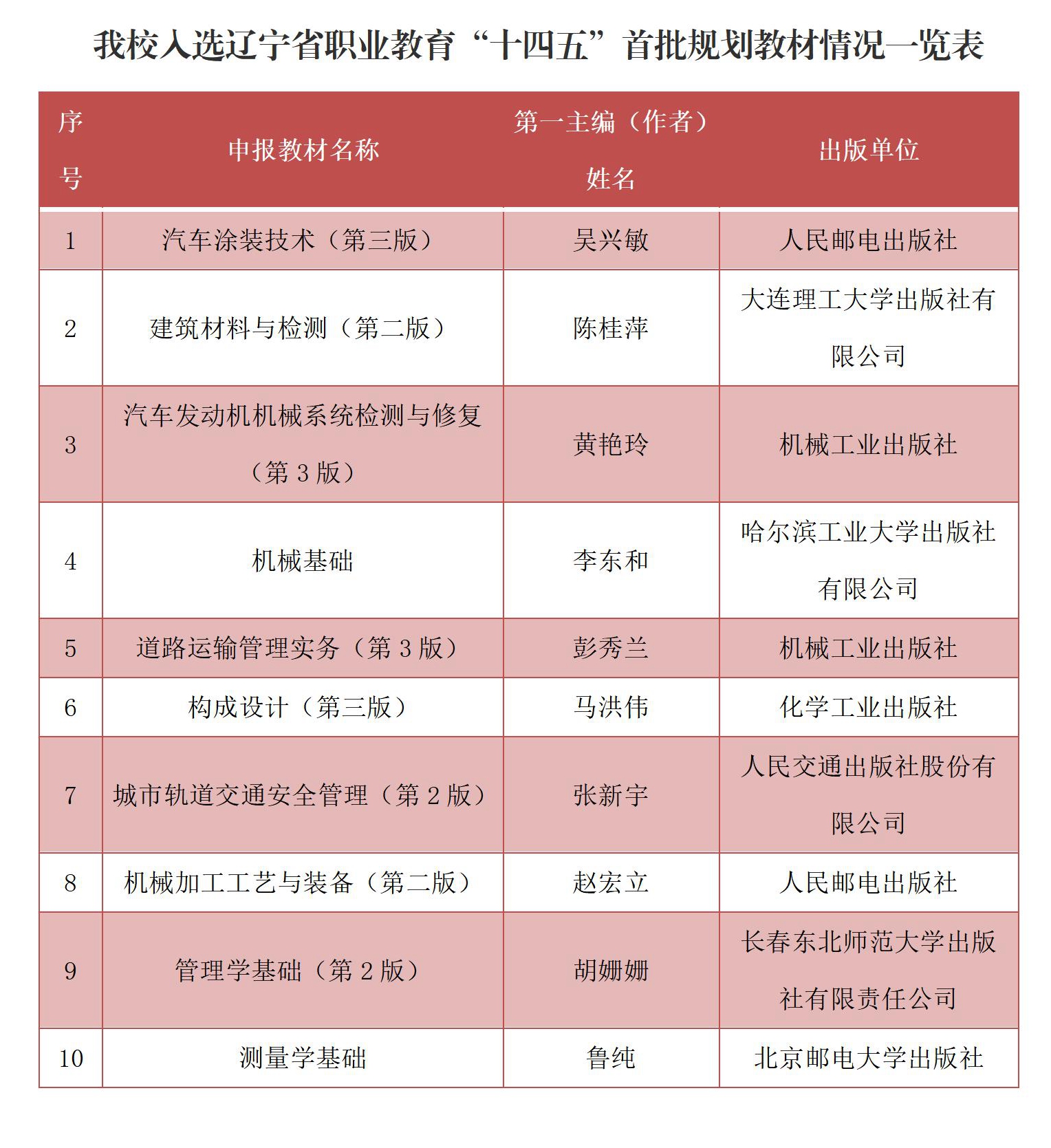近日,辽宁省教育厅公布了辽宁省职业教育“十四五”首批规划教材书目,我校10种教材入选,其中8种教材入围“十四五”首批职业教育国家规划教材辽宁省推荐项目。这是继2021年荣获首届全国教材建设先进集体、全国优秀教材一等、二等奖后,我校在教材建设改革领域取得的又一项荣誉。