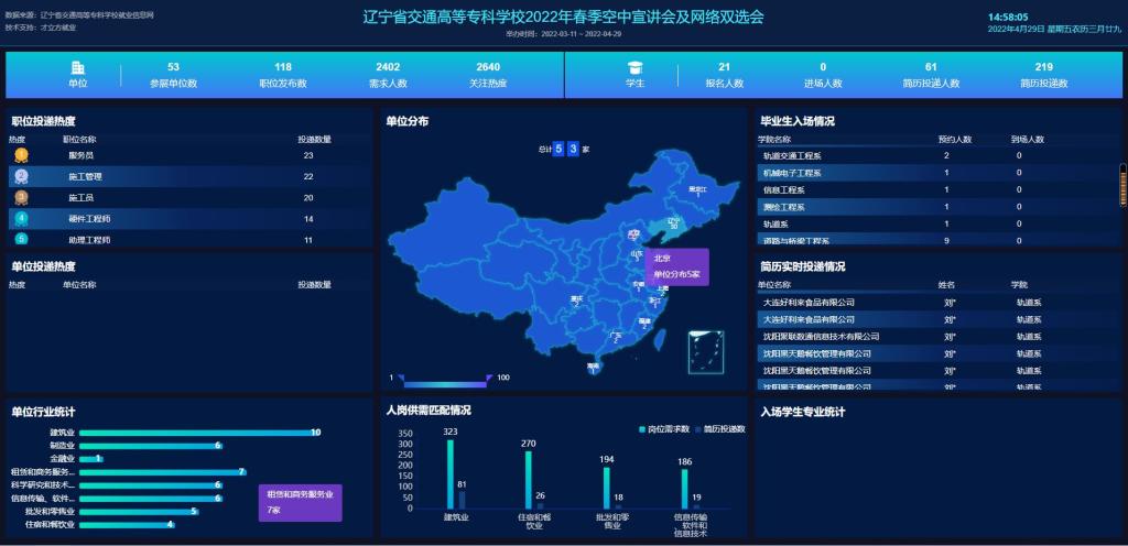 为积极应对疫情影响,促进毕业生充分就业、高质量就业。4月29日,我校组织召开了2022届毕业生春季网络双选会,双选会共有中建桥梁有限公司、黑龙江农垦建工路桥有限公司、中国核工业二三建设有限公司南方分公司、奇瑞汽车股份有限公司、华住酒店管理有限公司等53家用人单位参会,提供就业岗位2402个,涉及道桥、建筑、测绘、机械、汽车、电力电子、化工、材料、IT、酒店餐饮等多个专业门类。双选会得到了用人单位和毕业生的广泛关注,双选会平台浏览量近4万余次,1300余名毕业生参会。举办线上宣讲会13场,参与学生近千人次,各种途径投递简历800余份。