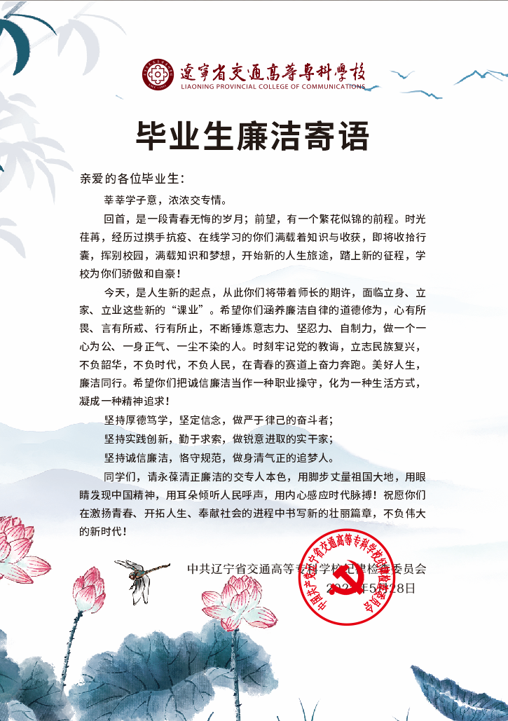 5月28日,是我校2022届毕业生喜获毕业证书,即将奔赴工作岗位的喜庆日子。他们今天是校园骄子,明天将是国家栋梁。在即将离校的时刻,学校纪委编制了廉洁寄语,勉励同学们永葆清正廉洁的交专人本色,严于律己,奋勇争先、不断书写自己人生新的美丽华章,不负伟大的新时代!