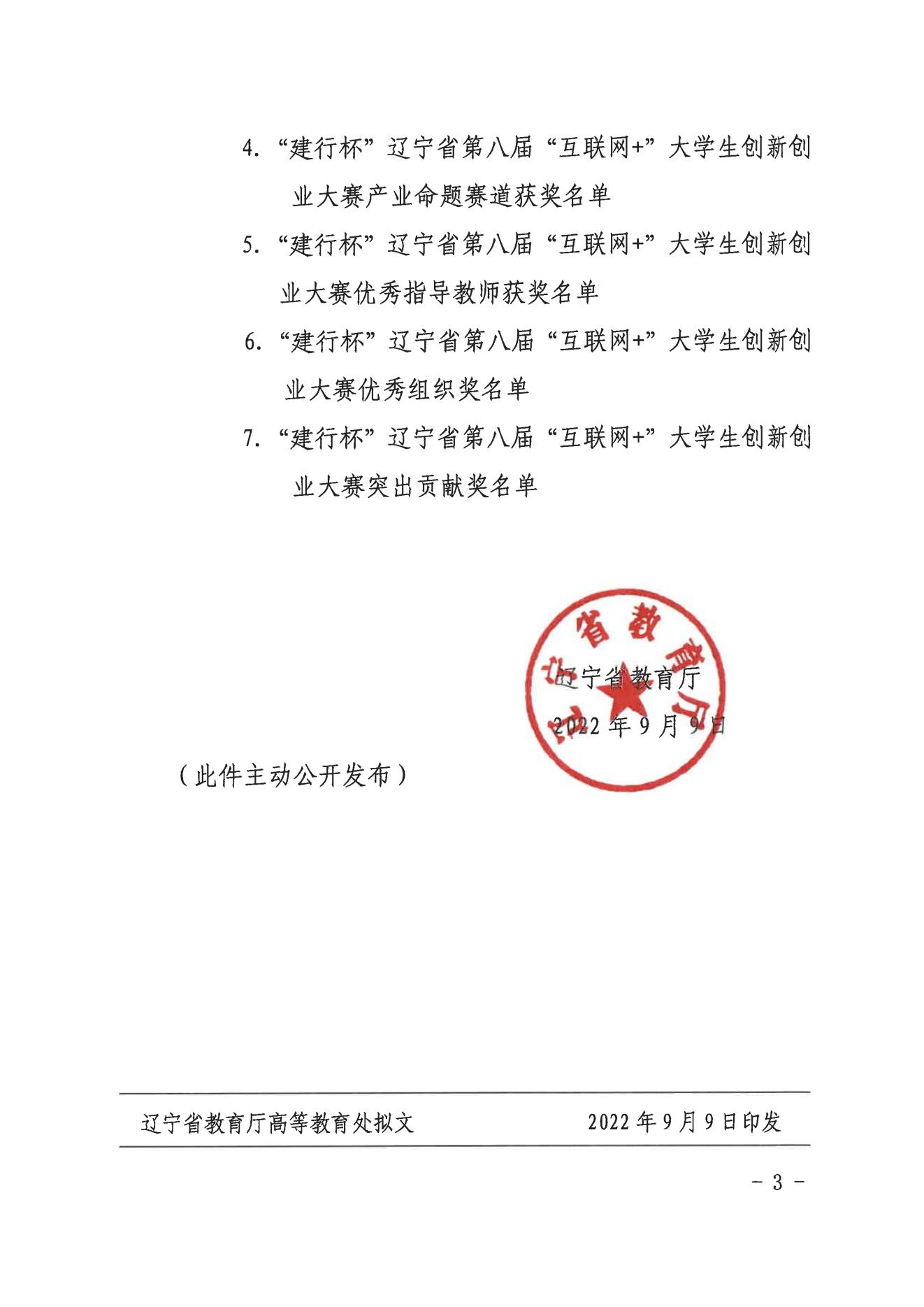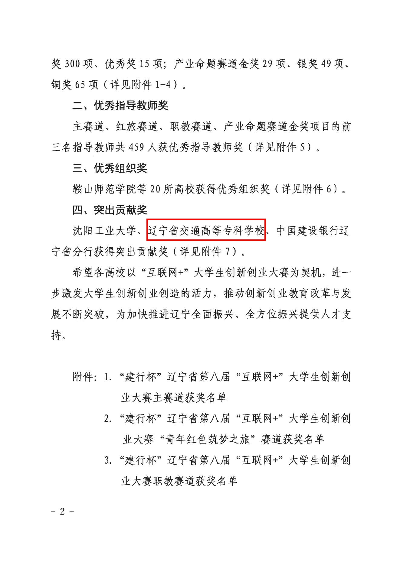 近日,“建行杯”辽宁省第八届“互联网+”大学生创新创业大赛决赛落下帷幕,本届比赛共有省内95所高校的90226个项目报名参赛。经过激烈角逐,我校共有53个项目在本届大赛中获奖,创历史新高。其中“职教赛道”荣获金奖5项、银奖16项、铜奖26项,“青年红色筑梦之旅赛道”荣获铜奖5项,产业赛道荣获银奖1项;11名教师荣获“优秀指导教师”;我校因承办职教赛道赛事组织有力有效、比赛成绩优异,荣获“突出贡献奖”、“优秀组织奖”。