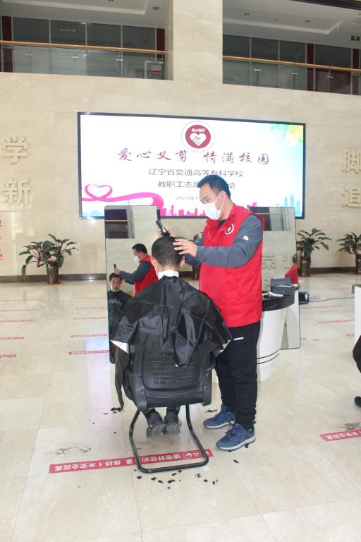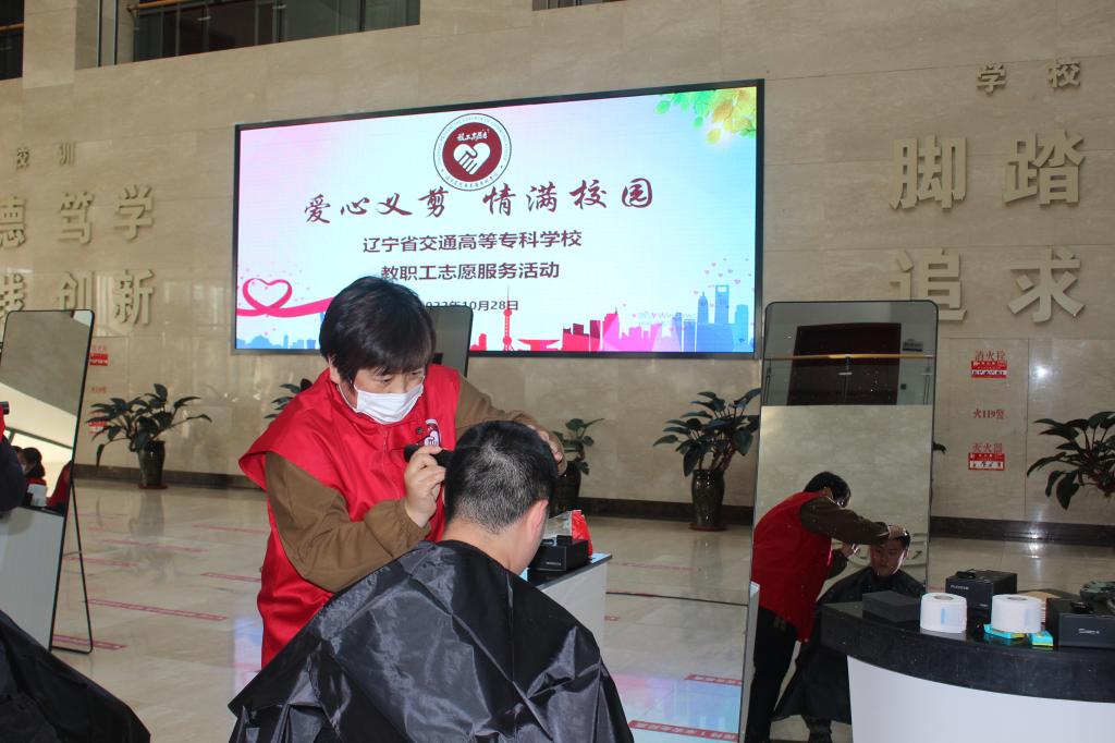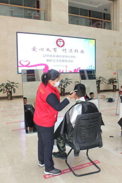 2022年10月28日下午,我校工会在学生素质教育中心一楼大厅组织开展了“爱心义剪 情满校园”教职工义务理发志愿服务活动,为士官班的同学们义务理发。