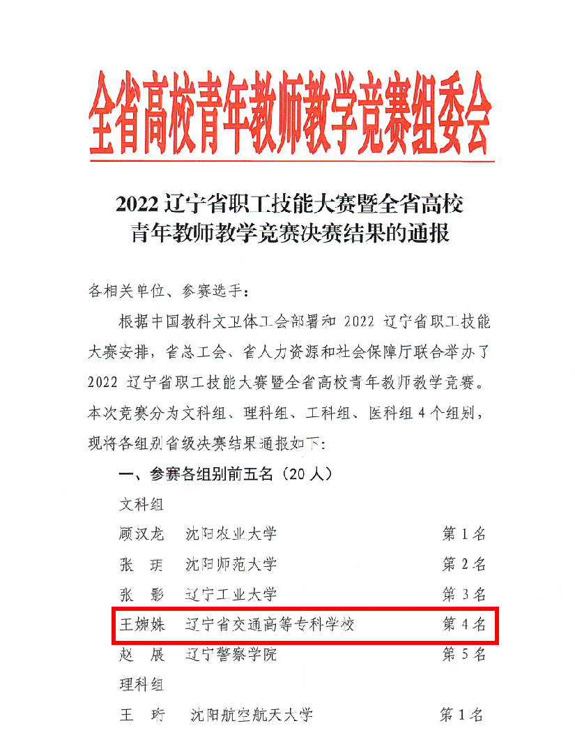 近日,由辽宁省总工会、辽宁省人力资源和社会保障厅联合举办的2022年辽宁省职工技能大赛落下帷幕。本届比赛由省总工会直属高校、各市属高校代表共同参加。比赛按照项目共分为全省高校青年教师教学竞赛和全省高校青年教师思想政治课教学大赛两个并列赛事。其中全省高校青年教师教学竞赛又分为文科组、理科组、工科组、医学组四个组别。比赛由全省40岁以下的数名青年教师报名参与,经预赛、省级初赛直至省级决赛。经过激烈的角逐,我校马克思主义学院教师李景春以全省高校青年教师思想政治课教学大赛全省第四名,管理工程系教师王婉姝以文科组全省第四名的好成绩完成了本次全省青年教学竞赛。我校工会在组织参与比赛过程中动员积极有力、部署及时高效、比赛成绩优异,荣获全省高校青年教师思想政治课教学大赛“优秀组织奖”和全省高校青年教师教学竞赛“优秀组织奖”。