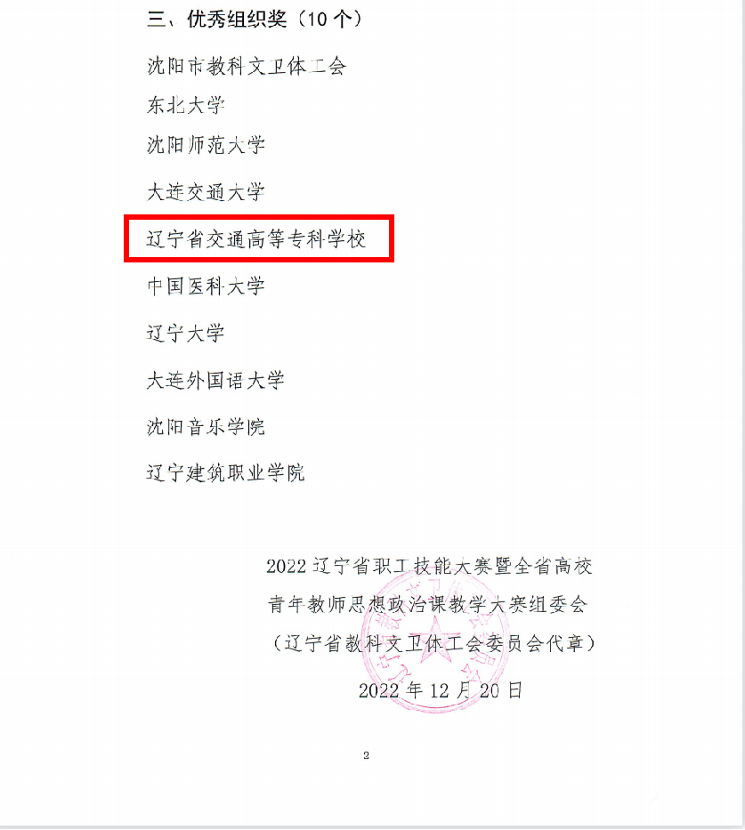 受省内疫情的影响,2022年辽宁省职工技能大赛决赛赛程有所延迟,一直延迟至12月13日,两位晋级决赛的选手在有限的时间里积极备赛、认真练习、克服各种困难,代表学校最终取得了优异的成绩。新的一年,学校将以本次全省高校青年教师教学竞赛为契机,坚定不移落实立德树人根本任务,坚持不懈用习近平新时代中国特色社会主义思想铸魂育人。搭建好以赛促教、以赛促改、以赛促建的平台,不断提升我校教师尤其是青年教师的教学能力,增进学校教学团队整体的核心凝聚力,不忘初心,砥砺前行,为我校“双高”建设增光添彩!