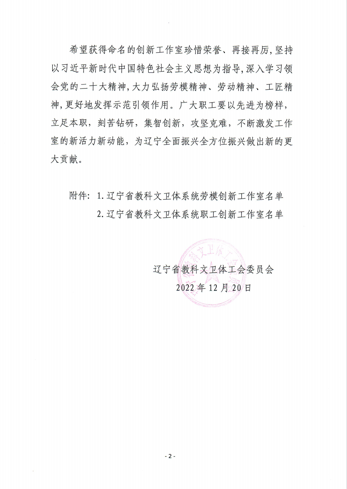 近日,辽宁省总工会公布了《关于命名2022年度辽宁省教科文卫体系统劳模创新工作室和职工创新工作室的通报》,我校黄艳玲职工创新工作室被授予为“辽宁省教科文卫体系统职工创新工作室”。