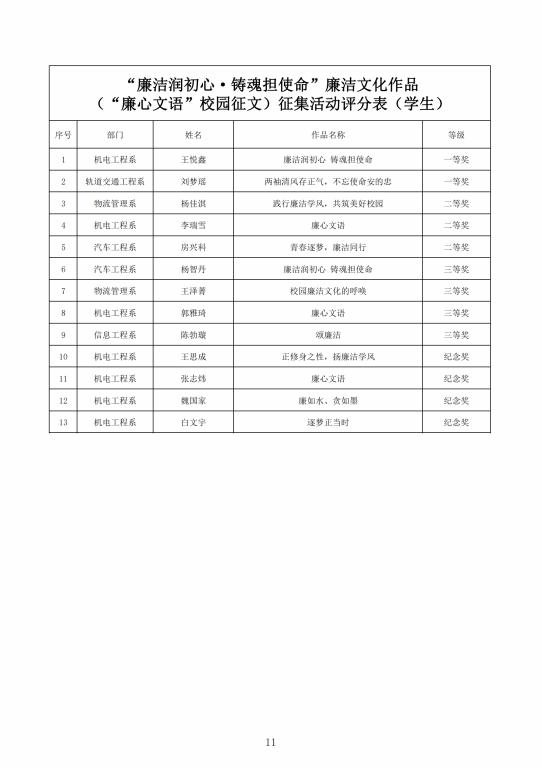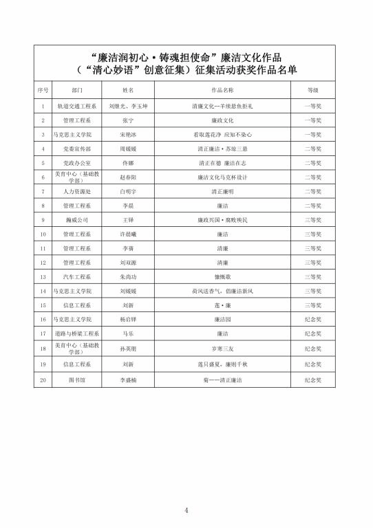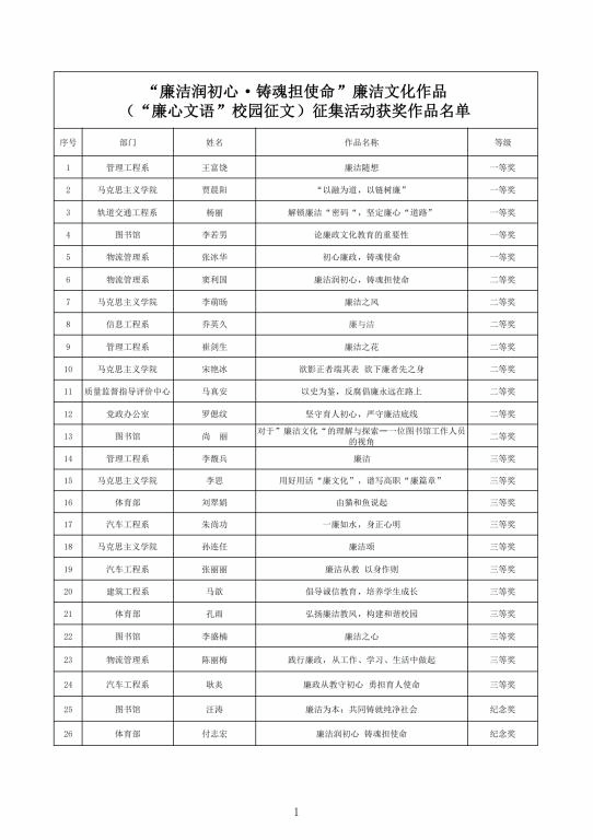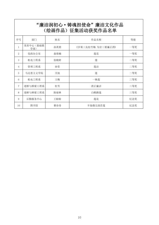 征集廉洁文化作品,加强清廉校园建设。面向全校师生开展了“廉心文语”校园征文、“润心话语”视频征集、“清心妙语”创意征集、廉政教育书法、绘画、摄影作品征集活动。活动共征集到作品二百余项。学校纪委组织专家对征集作品进行评比,最终评选出一、二、三等奖作品若干(获奖名单见附件),充分调动了教职工参与廉洁文化建设的主动性、积极性和创造性,在师生中营造浓厚廉洁文化氛围。