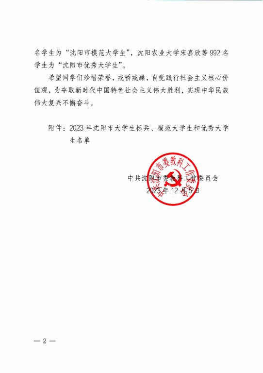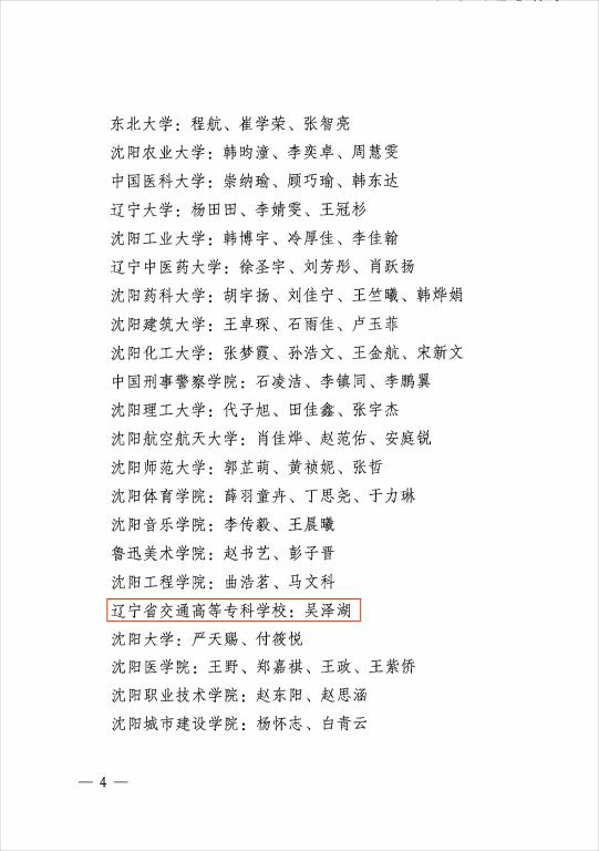 近日,由中共沈阳市委教科工作委员会组织开展的2023年度沈阳市“十百千”优秀大学生评选活动结果揭晓,我校管理工程系2021级会展策划与管理专业徐双挥同学荣获“2023年度沈阳市大学生标兵”、道路与桥梁工程系2021级道路与桥梁工程技术专业吴泽湖同学荣获“2023年度沈阳市模范大学生”称号,郭治辰等25名同学荣获“2023年度沈阳市优秀大学生”称号。