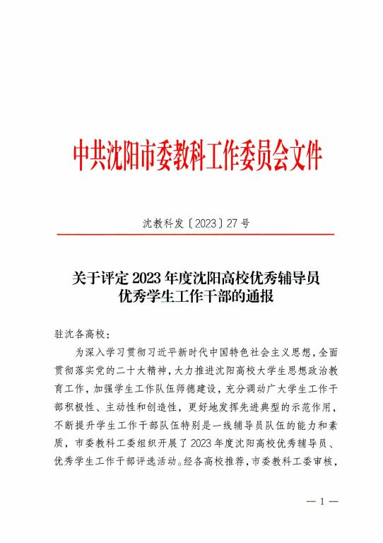 近日,由中共沈阳市委教科工作委员会组织开展的2023年度沈阳高校优秀辅导员和优秀学生工作干部评选活动结果揭晓,我校汽车工程系樊亚明同志、建筑工程系揭丹同志、信息工程系李正伟同志、物流工程系王庆伟同志、测绘工程系王伟冬同志、机电工程系张晓婷同志荣获“2023年度沈阳高校优秀辅导员”称号,学生工作处处长王楠同志、汽车工程系党总支副书记孙影同志、心理健康教研室主任李良敏同志荣获“2023年度沈阳高校优秀学生工作干部”称号。