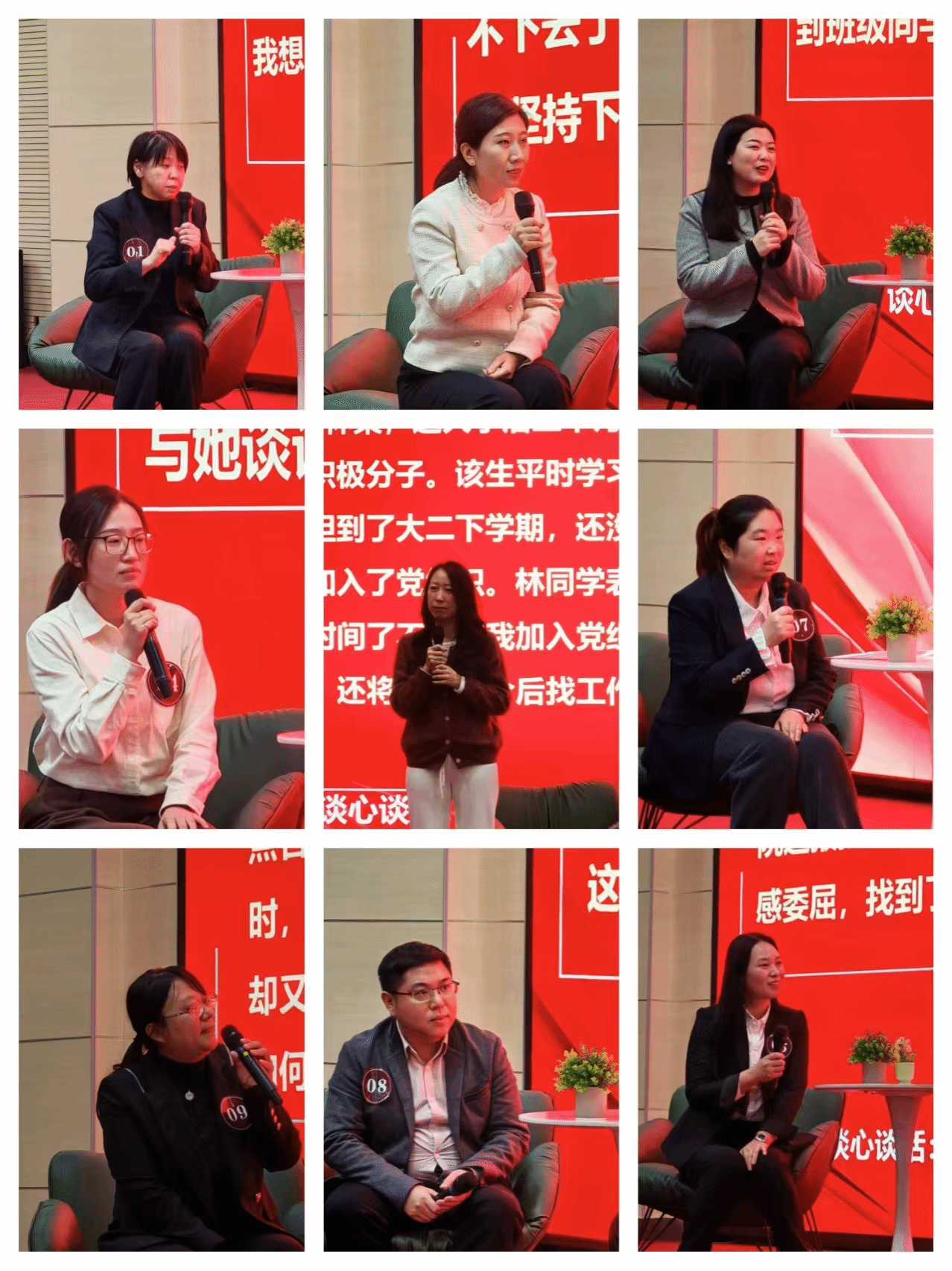 复赛为案例研讨部分,在“案例研讨”环节,辅导员们以“我提问,你回答”的方式开展,由A、B选手围绕案例,共同辨析原因、研讨对策、总结规律;经过现场比拼,最终共有9名辅导员进入决赛“谈心谈话”环节。