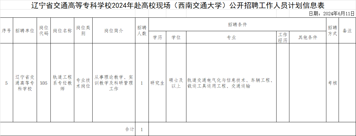 招聘条件与要求详见《辽宁省交通高等专科学校2024年赴高校现场公开招聘工作人员公告》、《辽宁省交通高等专科学校2024年赴高校现场公开招聘工作人员计划信息表》(见学校官网)。