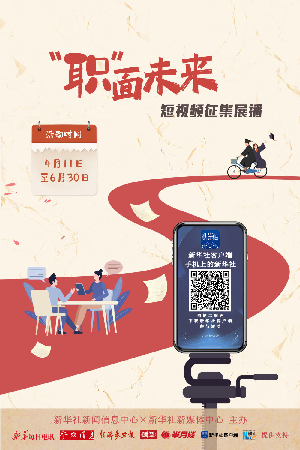 扫描海报二维码或下载新华社客户端搜索“职面未来/短视频/短视频征集/职业”参加活动。