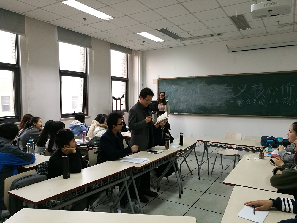 社会主义核心价值观是社会主义价值体系中最基础、最核心的价值观念,是社会主义社会科学发展的价值导向,是马克思主义指导思想和中国特色社会主义共同理想的价值内核,是对以爱国主义为核心的民族精神、以改革创新为核心的时代精神和社会主义荣辱观的价值升华和高度概括。社会主义核心价值观对在校学生的思想和行为起到确定方向、规范引导的作用。鉴于社会主义核心价值观的重要性,2016级税务硕士班委们在辅导员老师的指导下,在11月22日组织了一场以“我与社会主义核心价值观”为主题的班会。