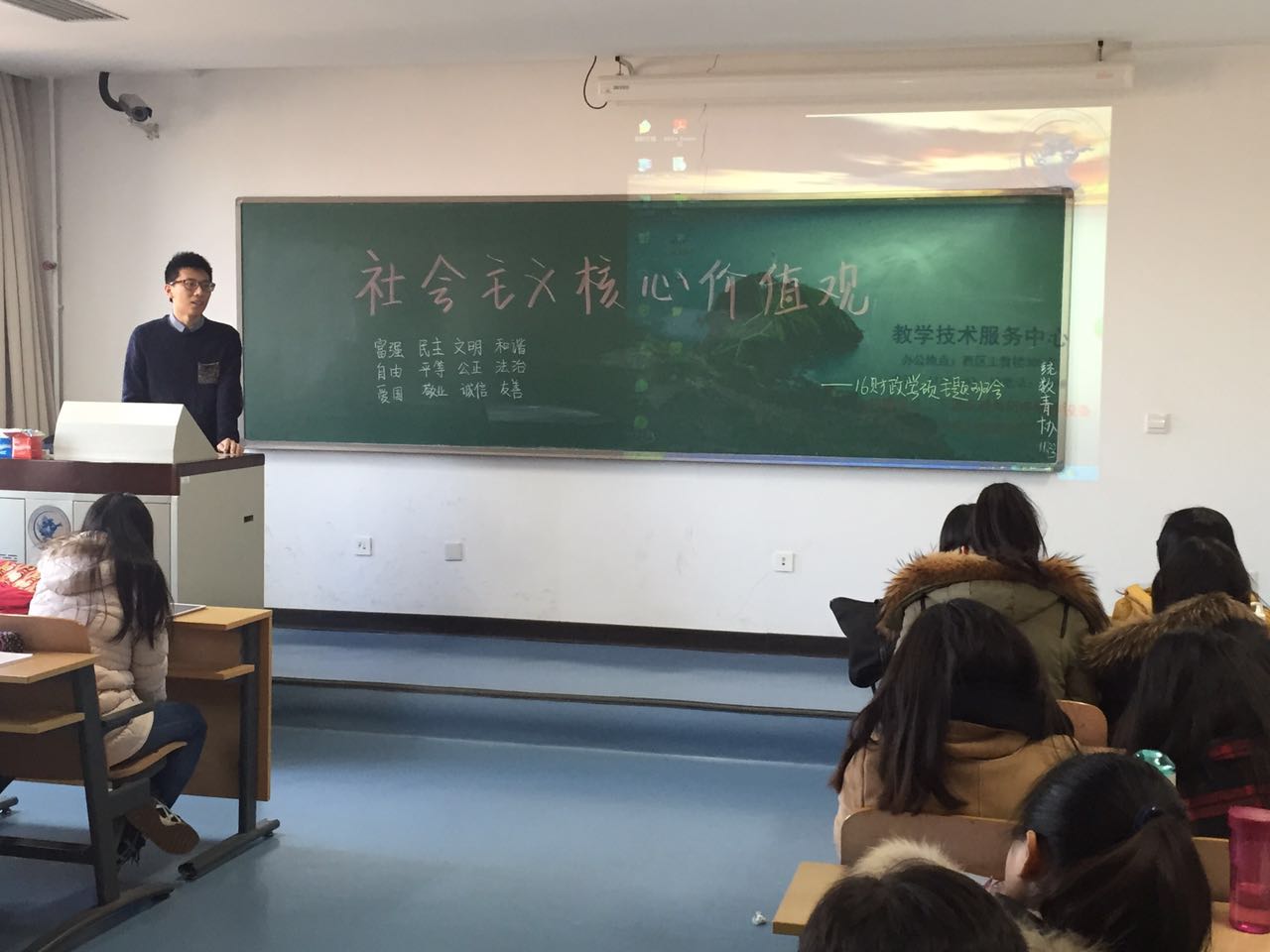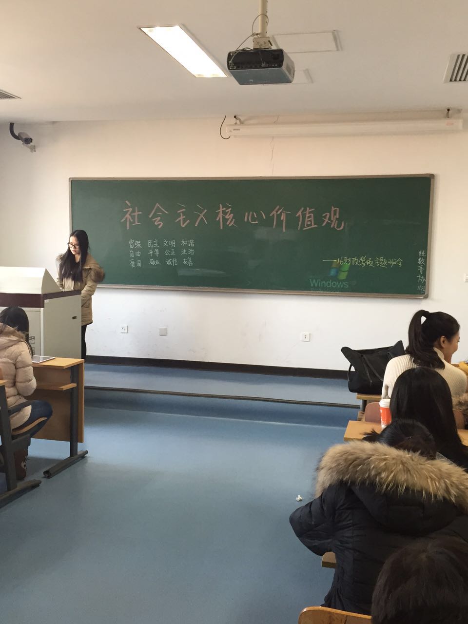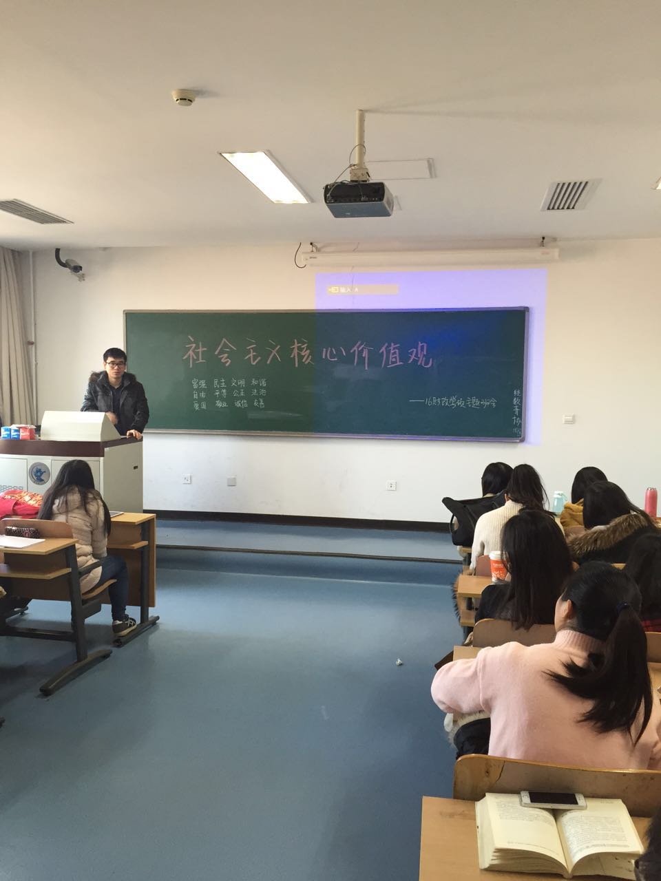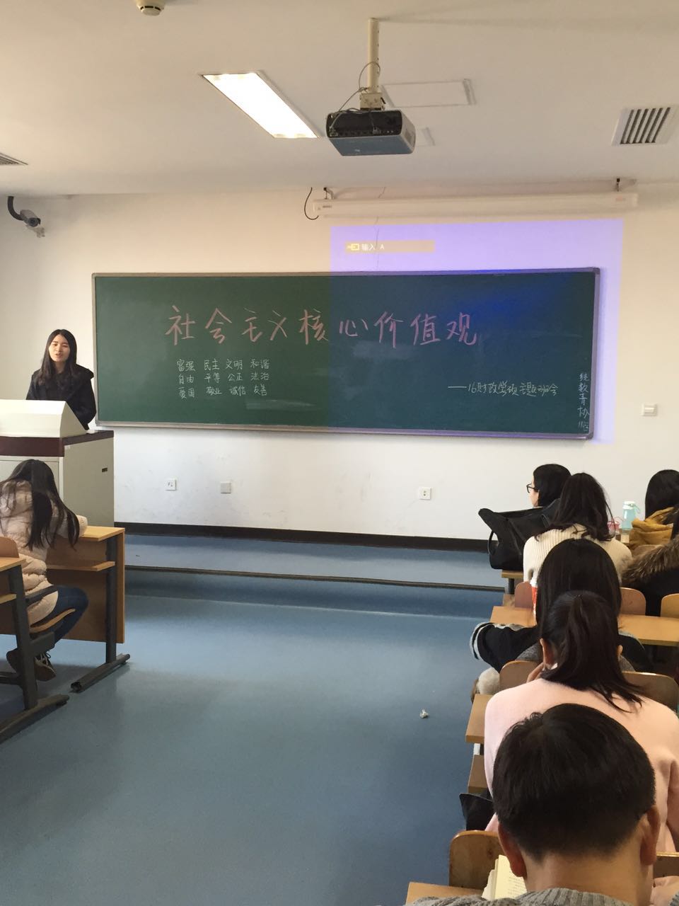 为了正确树立和大力弘扬社会主义核心价值观,用社会主义核心价值观引领学校德育工作,11月24日,16财政学硕士班开展了“社会主义核心价值观”主题班会活动。 在团支书刘银乔的主持下,大家一起围绕社会主义核心价值观讨论了多个问题,围绕富强、民主、文明、和谐、自由、平等、公正、法治,倡导爱国、敬业、诚信、友善展开了自己观点的论述。