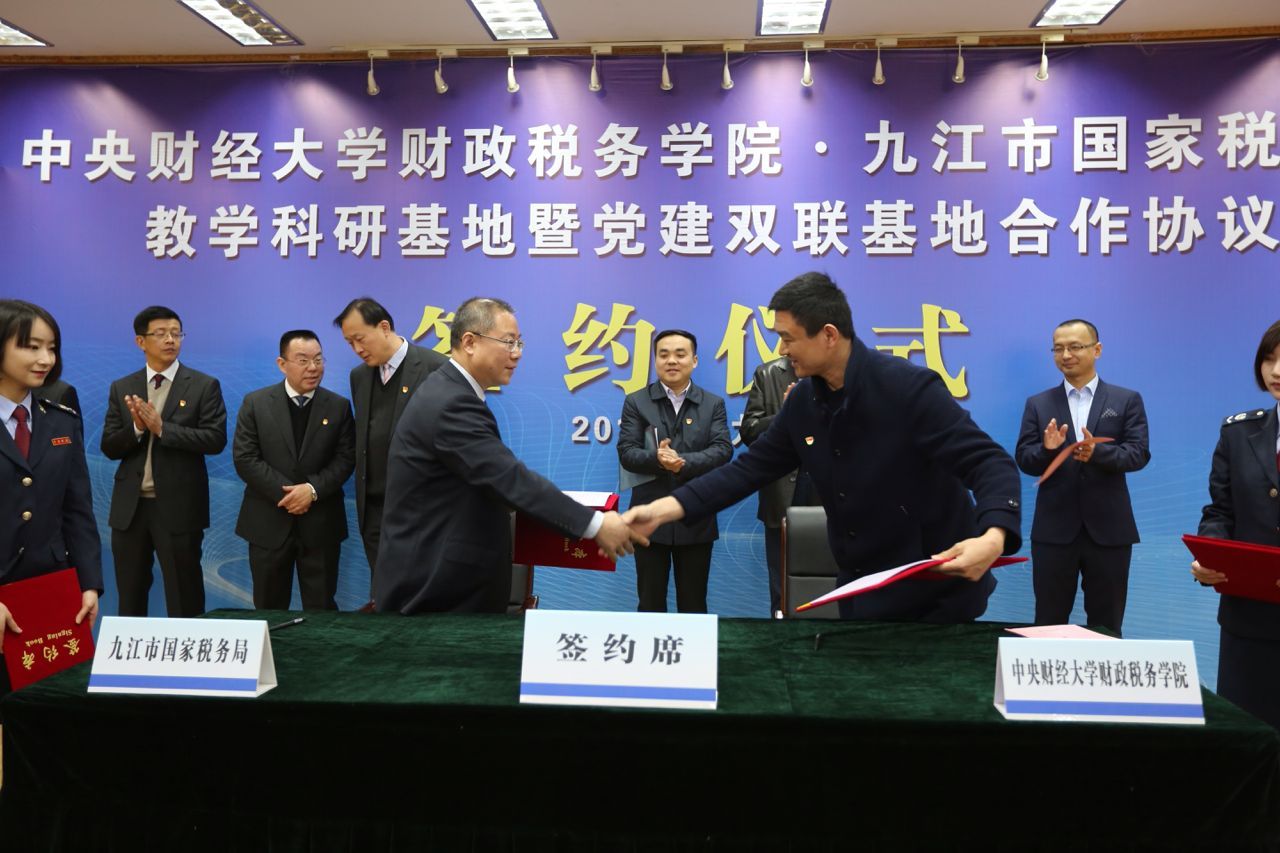 3月16日上午,财政税务学院与九江市国税局教学科研基地暨党建双联基地合作协议签约仪式在九江市国税局三楼会议室隆重举行。九江市国税局各县(市、区)局主要负责人、市局直属单位班子成员、市局机关全体干部在主会场参会。财政税务学院党委书记樊勇教授、副院长任强教授、刘桓教授、李严波老师参加了签约仪式。仪式由九江市国税局党组副书记、副局长裘庆平主持。