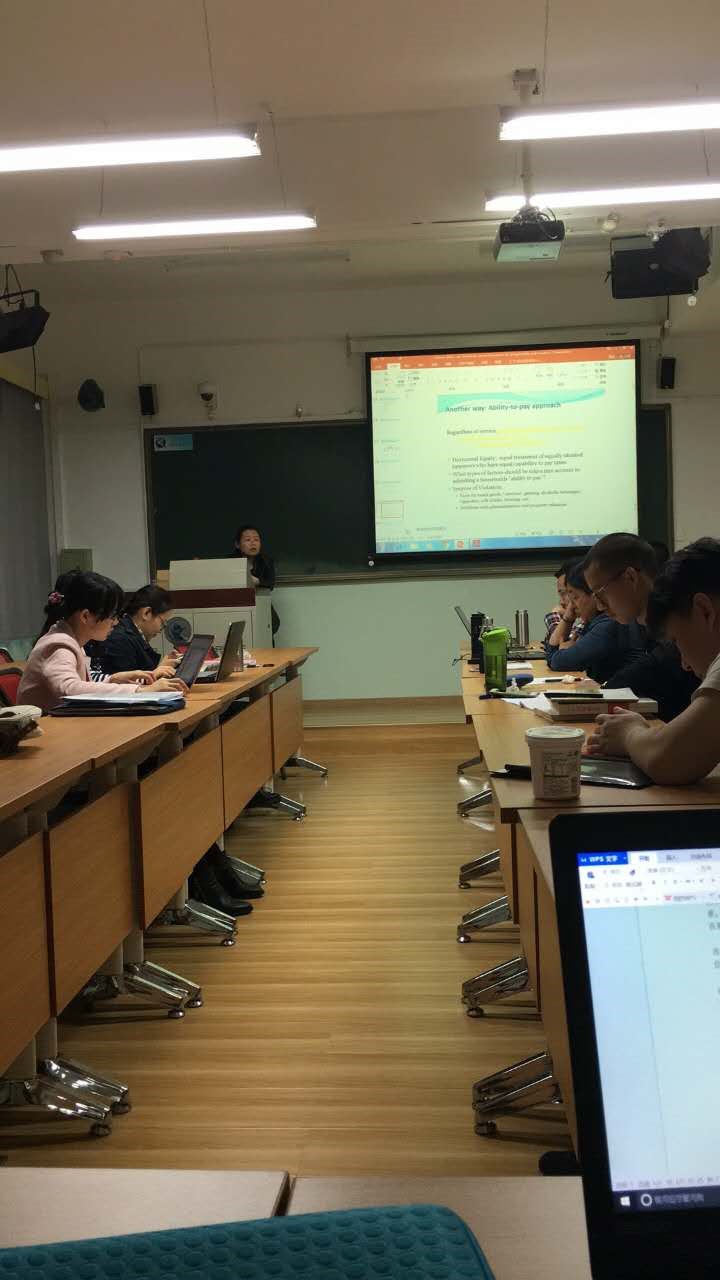 其中,4.21日下午的课上,王倩教授还就其论文“支出者与受益者?—州政府税收与预算对税收累进性与收入再分配的影响“进行了学术演讲。财政税务学院何杨老师、汪昊老师、任强老师以及一些博士生等都参与课程讨论。王教授先就相关研究的文献进行回顾,提出本文的研究思路,验证高收入者与低收入者所支付的税收与所得到的收益是否公平。通过两阶段最小二乘法进行检验得出联邦政府能更多地进行州政府之间的税收转移时税收更加公平。另外,王教授还讲解了美国财产税,美国财产税征收实际是一个倒推的过程,首先根据政府预算减去非财产税的其他税收收入去预测需征收的财产税,然后再评估房产价值,两者相除就是州政府制定房产税率的依据。最后,王教授还介绍了共享经济下税制的评估,以圣弗朗西斯科租房市场为例,对于短租房屋收入存在税收空白,只能依靠个人自主申报,政府在这方面征收存在困难,尤其是对诸如Airbnb等网站上的租房交易收入。