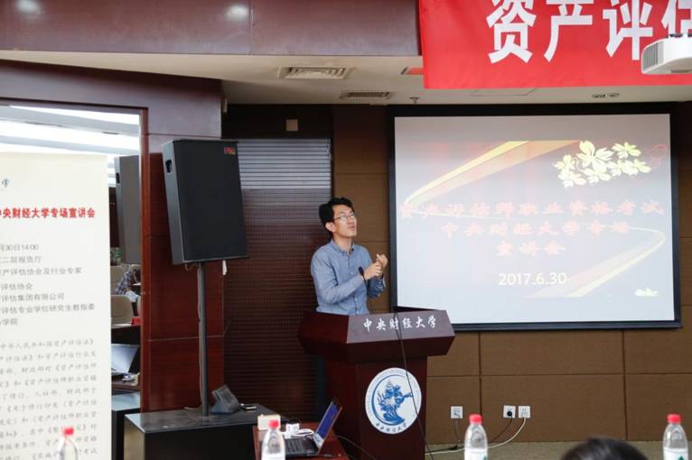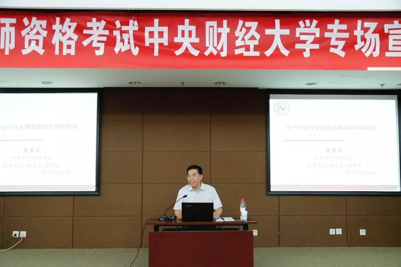 2017年6月30日,由中国资产评估协会、中联资产评估集团有限公司主办,中央财经大学财政税务学院承办的“资产评估师考试中央财经大学专场宣讲会”在中财大厦二层报告厅成功举办。中国资产评估协会秘书长张国春、副秘书长杨松堂、培训总监赵金娥,中联资产评估集团有限公司董事长范树奎、合伙人兼副总裁邓艳芳、合伙人兼总裁助理吴晓光、高级经理刘晨,中央财经大学副校长李俊生教授、财政税务学院院长白彦锋教授、财政税务学院党委副书记宋立岩、副院长肖鹏教授、副院长任强教授以及财政税务学院、会计学院的100余名师生参加了本次宣讲会。宣讲会由中央财经大学财政税务学院院长白彦锋教授主持。