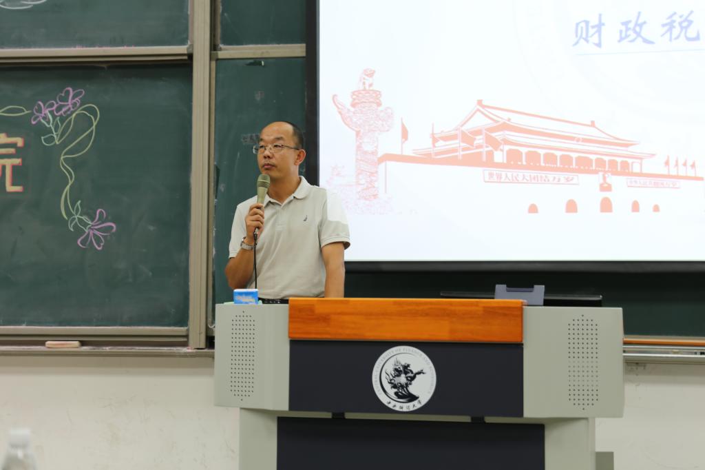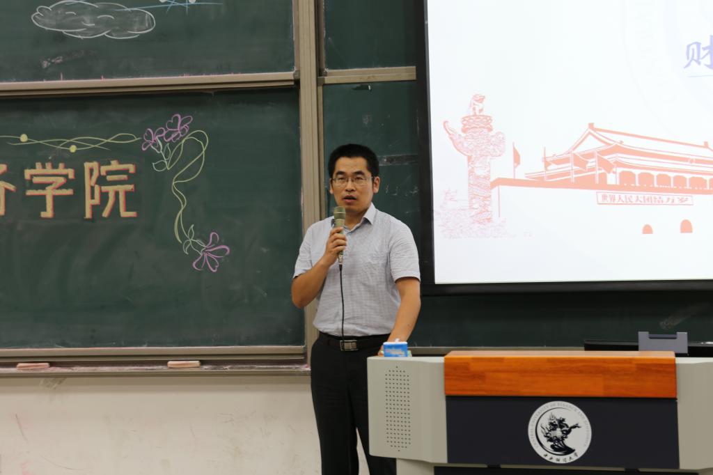首先,由白彦锋院长发表了讲话,他向2017级的同学表达了热切的欢迎,为新生上了第一课。他以北邮同学大二辍学的例子告诫同学们大学生活中老师们不会时刻跟随在同学们身边,要处理好游戏、看片和大学生活之间的关系,正确看待交友和恋爱,要有健康的精神生活。紧接着,白院长介绍了学校、学院的历史发展,并详细介绍了学院的几大专业和学科和各种发展方向。在对同学们的优异成绩给予肯定和鼓励后,白院长提到中国目前已经是全球第二大经济体,位于世界前列,经济发展要有学术,有理论,目前同学们接受的鲜花和掌声已经足够多,要谨记“生于忧患,死于安乐”的道理,鼓励同学们珍惜大学的学习时光,不要做一个消费者消费荣光,要成为一个生产者为学校增光添彩,为祖国做贡献。随后,他提到在大学生活中同学们要学会理财,俭以养德,并且要培养批判性思维方式,“贵有恒何必三更眠五更起,最无益只怕一日曝十日寒”,推荐大家可以通过听广播来积累对财税问题的敏感度,并以王亚男治学的例子提醒同学们注重锻炼身体。最后他提到,财政学是用大智慧推进国家治理,经世济民,期待大家努力学习,成为财税改革的“弄潮儿”。