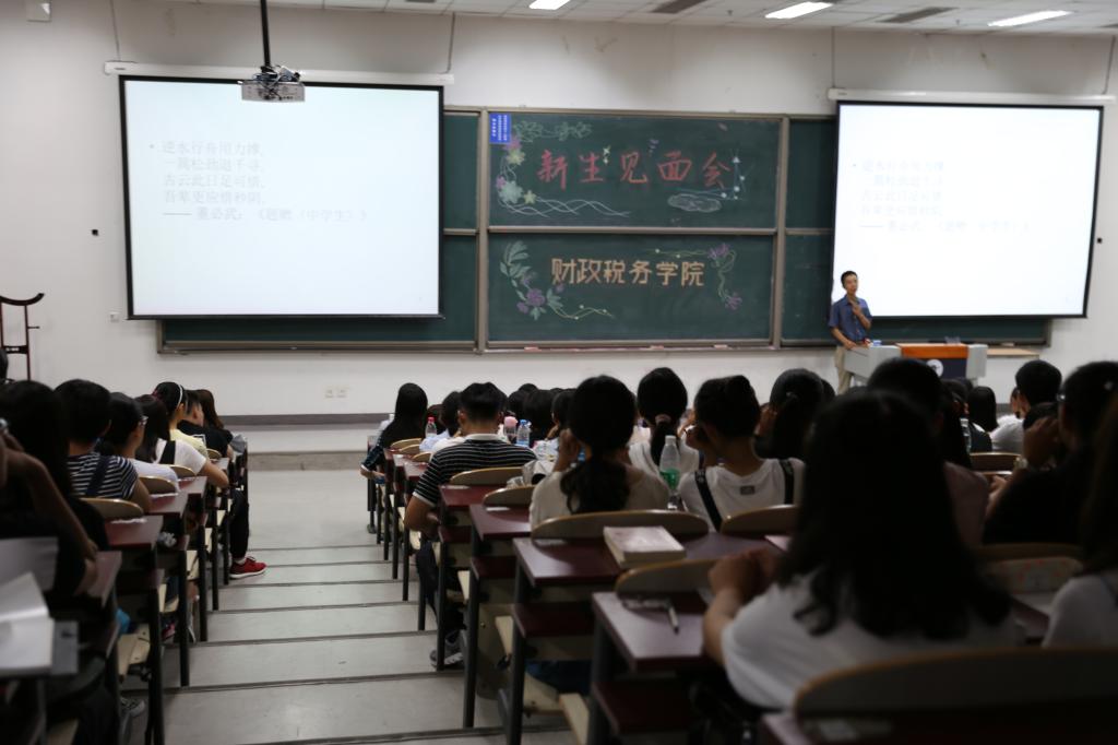 9月7日晚上,财政税务学院在中央财经大学东区主教110召开了新生见面会。出席本次活动的有财政税务学院院长白彦锋老师,党委副书记宋立岩老师,副院长肖鹏老师、任强老师,1班班主任郭靖老师、2班班主任童健老师、3班班主任孙会霞老师、4班班主任黄云老师、5班班主任刘金科老师、6班班主任赵涛老师,教学科研办公室主任庞淑芬老师,学生办公室主任于来老师,2017级新生辅导员徐燕妮老师,团委副书记陈颖老师。本次新生见面会由党委副书记宋立岩主持,2017级全体同学参与了见面会。