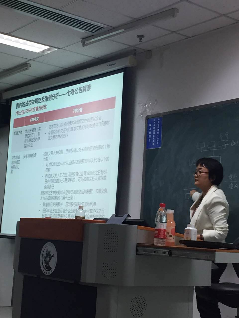 9月28日晚,在沙河校区6-106教室,财政税务学院17级税务专业硕士案例研讨课第3期(总第13期)如期开讲。此次的主讲人为京东集团税务总监张爱华老师。张老师通过法规解读、案例讲解为同学们介绍了非居民企业间接股权转让的相关知识。刘金科老师主持并参加了此次案例研讨课,杨虹教授、黄云教授也参加了这次课程,并同张老师开展了热烈的讨论。