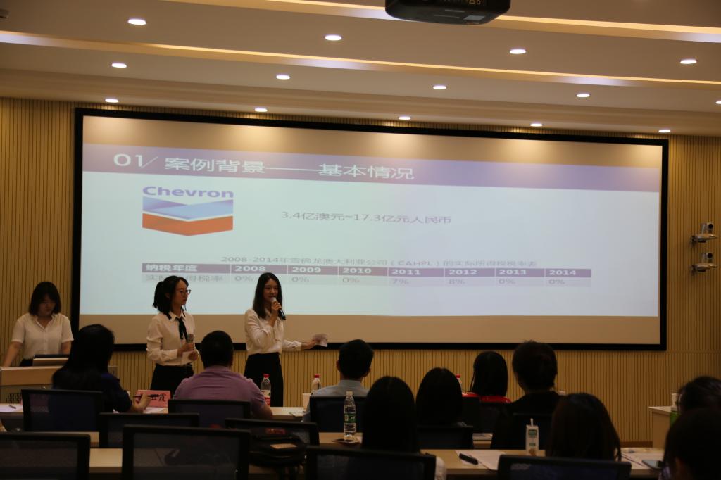 龙佳希队和王思月队分别抽到第一名和第八名的展示顺序。进行第一个展示的龙佳希和张雪麒同学虽然充满压力,但在展示过程中,这两位同学大胆地采用“税务案例大讲堂”的展示方式,将案例浅显易懂的剖析给大家。她们以澳大利亚雪佛龙集团税务案为基础,通过结合澳大利亚及美国税法的相关规定,分别从雪佛龙集团的离岸融资结构、集团关联融资安排被重新定性的原因以及集团所涉及的双重征税风险进行分析,探讨了关联交易的独立交易原则,并对案例所引发的问题进行了进一步思考,为我国企业在后BEPS浪潮下 “走出去”提供参考。她们在问答环节中的表现也是可圈可点,面对评委们的犀利提问,不仅表现出强大的心里素质,也展现了我院学子扎实的专业素养,给这场比赛开了个好头。
