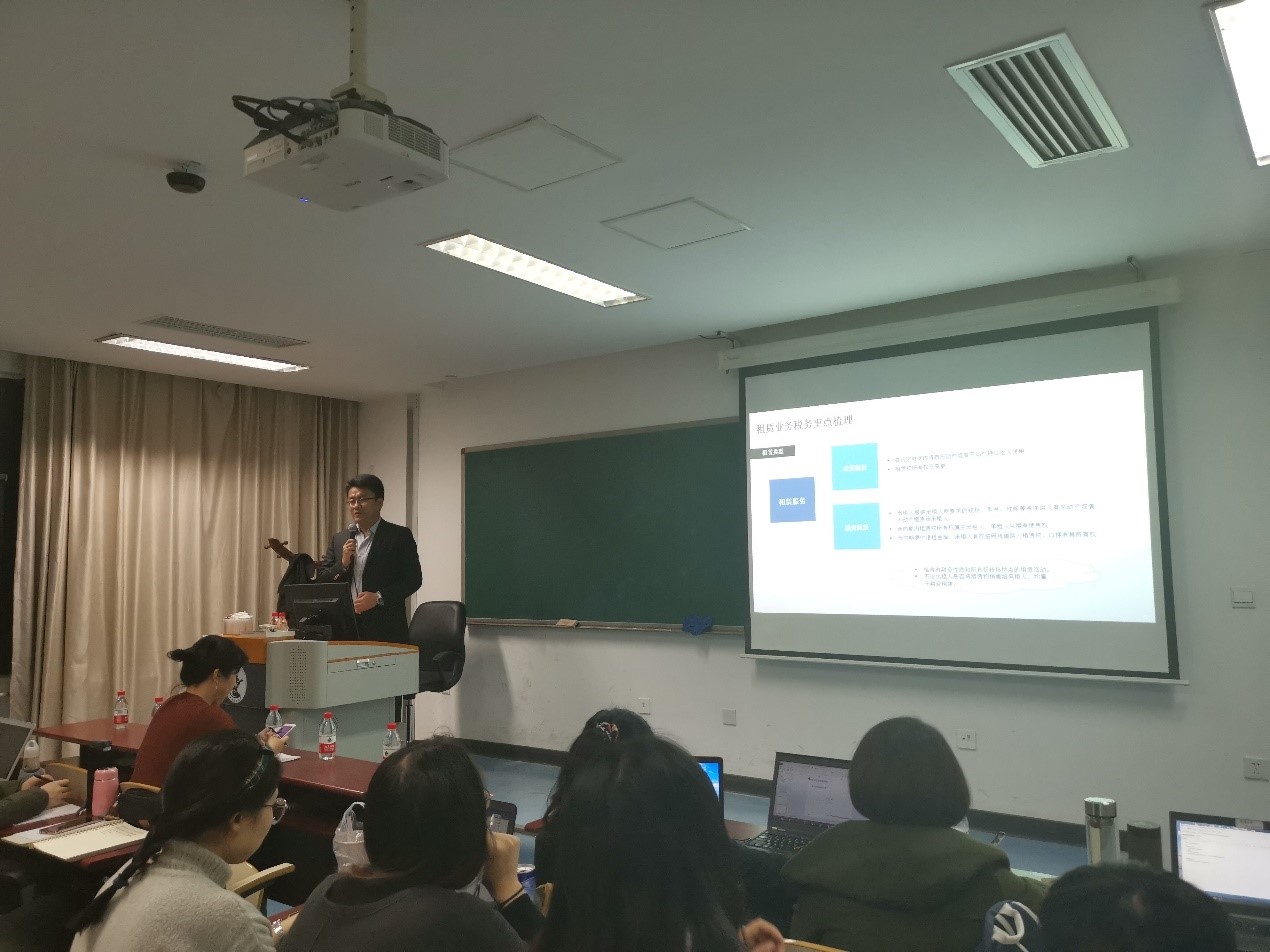 2018年11月15日晚6点30分,在中央财经大学沙河校区西区505教室,财政税务学院2018级税务专业硕士第37期税收综合案例研讨课如期开讲。本期主讲嘉宾为校外导师宫滨先生,讲座由何杨老师主持,梁俊娇老师、王文静老师、王怡璞老师参与了本次课程。