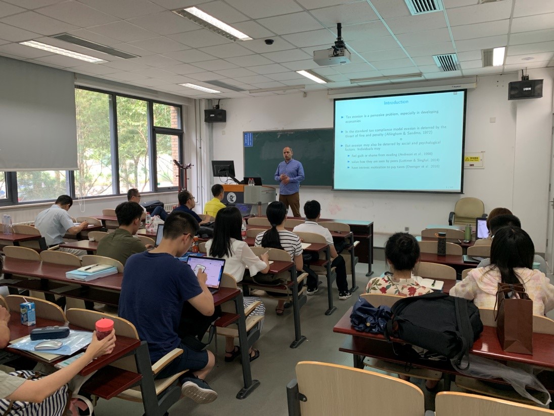 本次短期课程包括四个专题:《Pecuniary and Non-Pecuniary Motivations for Tax Compliance:Evidence from Pakistan》、《Information, Asymmetric Incentives, Or Withholding? Understanding the Self-Enforcement of Value-Added Tax》、《Does Cutting the Tax Rate to Zero Induce Behavior Different from Other Tax Cuts? Evidence from Pakistan》、《Taxes, Infromality and income shifting:Evidence from a recent Pakistani tax reform》。专题主要围绕征管和逃税展开,包括:(1)纳税信息披露对个人税收偷逃行为的影响(2)增值税改革扩围过程中企业的税收偷逃行为(3)税率变化过程中,个人收入瞒报行为的变化。(4)税率变化过程中,企业对自身组织形式以及进入退出策略的选择。同时,Mazhar 教授还就税收理论、巴基斯坦与中国税收政策的异同等问题与我校教师进行了深入讨论。