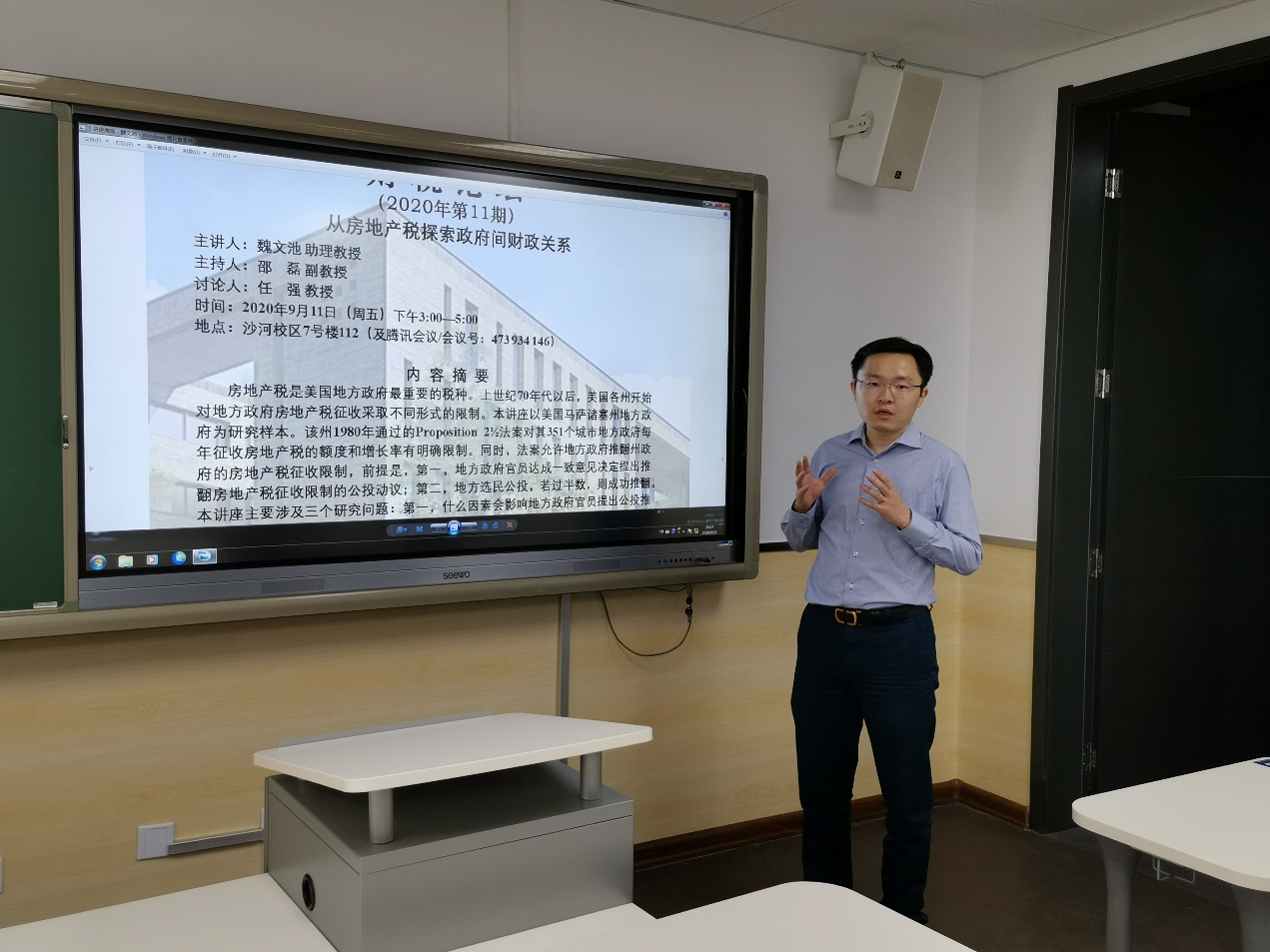 2020年9月11日下午,中央财经大学财政税务学院召开“从房地产税探索政府间财政关系”学术论坛(中财财税论坛2020年第11期),邀请中国人民大学公共管理学院助理教授魏文池老师报告关于美国基层政府结构以及马萨诸塞州房地产税限制的研究。本次讲座采取“线上”和“线下”相结合的形式,来自全国高校和科研院所的财税领域专家学者和财税学院部分师生参加了本次活动。