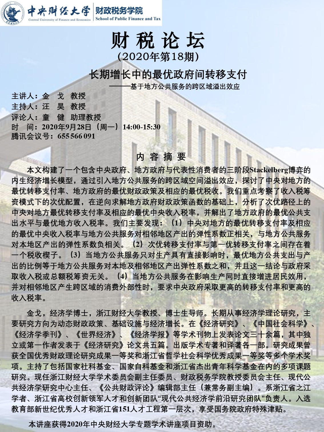 【财税论坛】18期:长期增长中的最优政府间转移支付