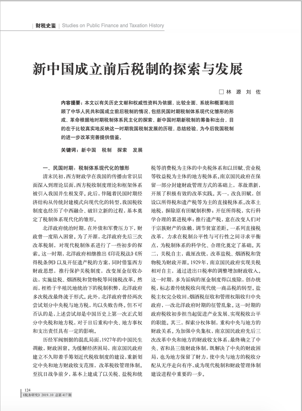 我院2019级博士研究生林源与中国财税法学研究会副会长、国家税务总局税收科研所原所长刘佐在《税务研究》2019年第10期合作发表《新中国成立前后税制的探索与发展》一文。
