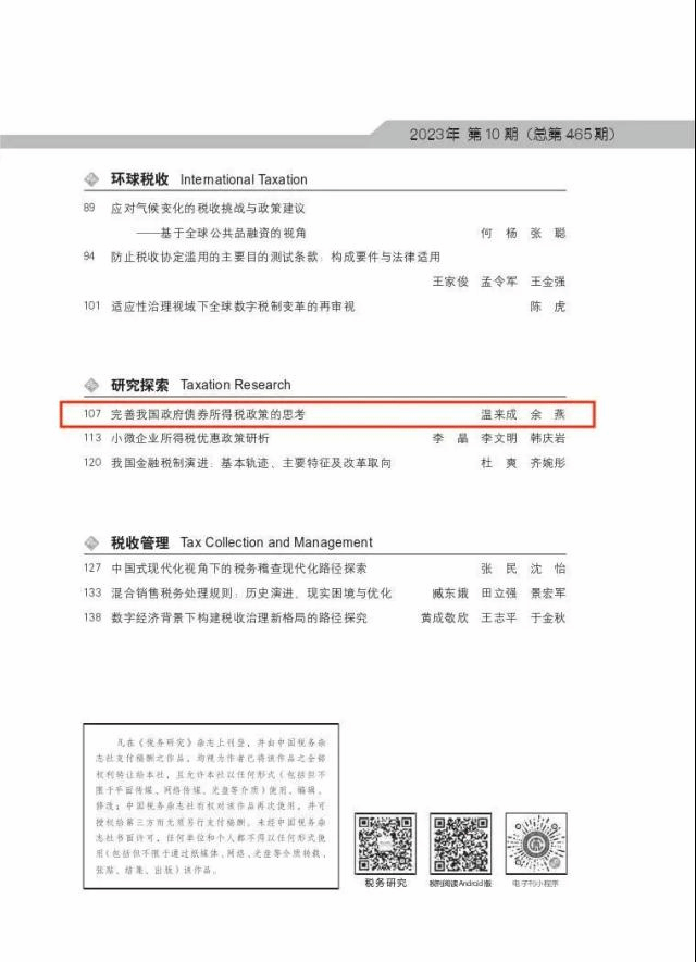 近日,由中央财经大学中财-安融地方财政投融资研究所执行所长、中央财经大学财政税务学院教授温来成和中央财经大学财政税务学院博士研究生余燕撰写的论文《完善我国政府债券所得税政策的思考》刊发于中文A类期刊《税务研究》2023年第10期。以下为文章主要内容: