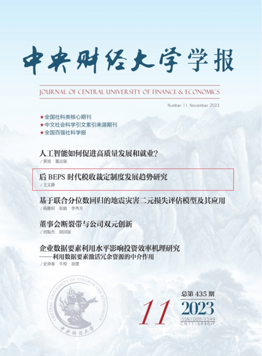 近日,由中央财经大学财政税务学院王文静副教授撰写的论文《后BEPS时代税收裁定制度发展趋势研究》在中文A类期刊《中央财经大学学报》2023年第11期作为封面文章刊发。以下为文章主要内容: