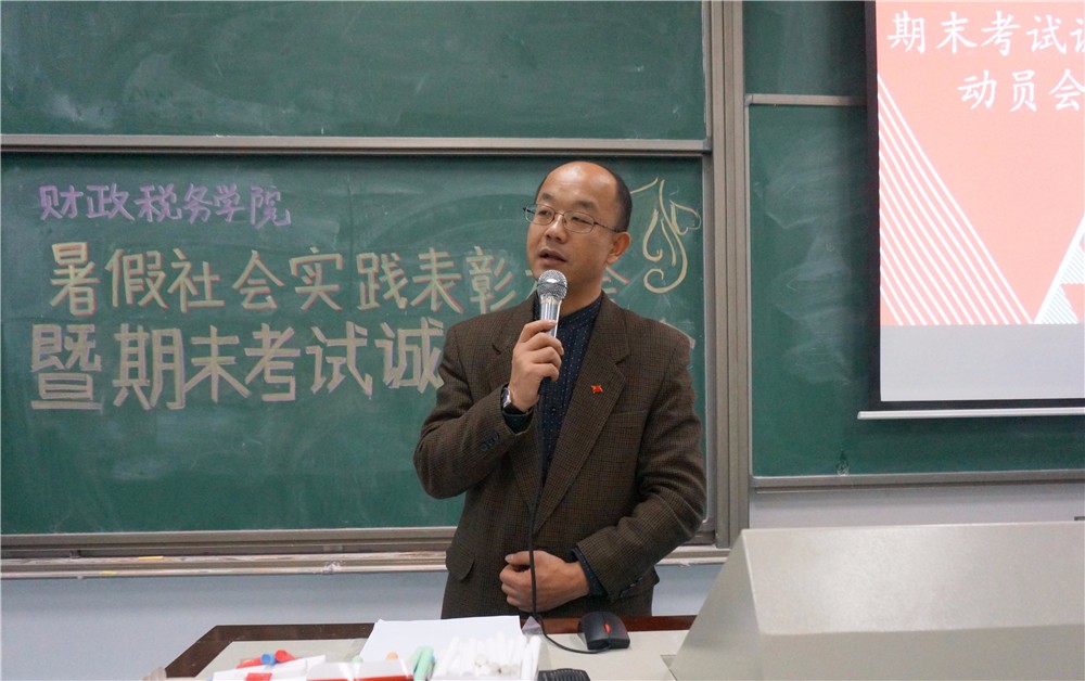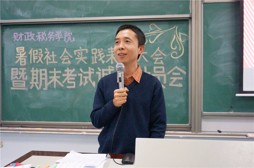12月20日晚,财政税务学院在沙河校区西区主教202进行了暑假社会实践表彰大会暨期末考试诚信动员大会。院长白彦锋老师,党委副书记宋立岩老师,本科生第一党支部书记兼2015级本科生辅导员马江聆老师,团总支书记兼2015级本科生辅导员蒋绮雯老师,2014级辅导员于钧光老师出席本次大会。财政税务学院大一、大二和大三的同学参与了本次大会。