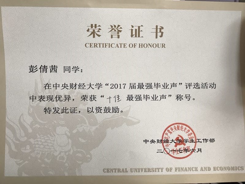 据悉,彭倩茜同学为少数民族学生,中共预备党员,曾获得北京市优秀毕业生、中央财经大学三好学生,连续四年荣获全面发展一等奖学金等。主持国家级大学生创新课题并获得国家级优秀结项,所发表论文入选教育部大创年会,公益创业项目获中国青少年发展基金会全国优秀项目奖。