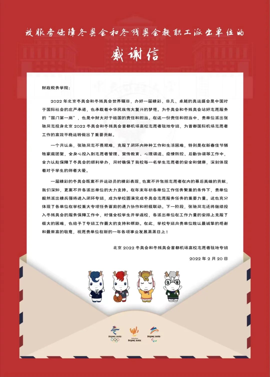 2022 年北京冬奥会和冬残奥会世界瞩目,办好一届精彩、非凡、卓越的奥运盛会是中国对于国际社会的庄严承诺,也承载着中华民族伟大复兴的梦想。为冬奥会和冬残奥会站好志愿服务的“国门第一岗”,也是中财大对于祖国的责任和担当。在这一份责任和担当中,贵单位派出张驰同志投身北京 2022 冬奥会和冬残奥会首都机场高校志愿者驻地专班,为首都国际机场志愿者工作的高效平稳运转做出了重要贡献。