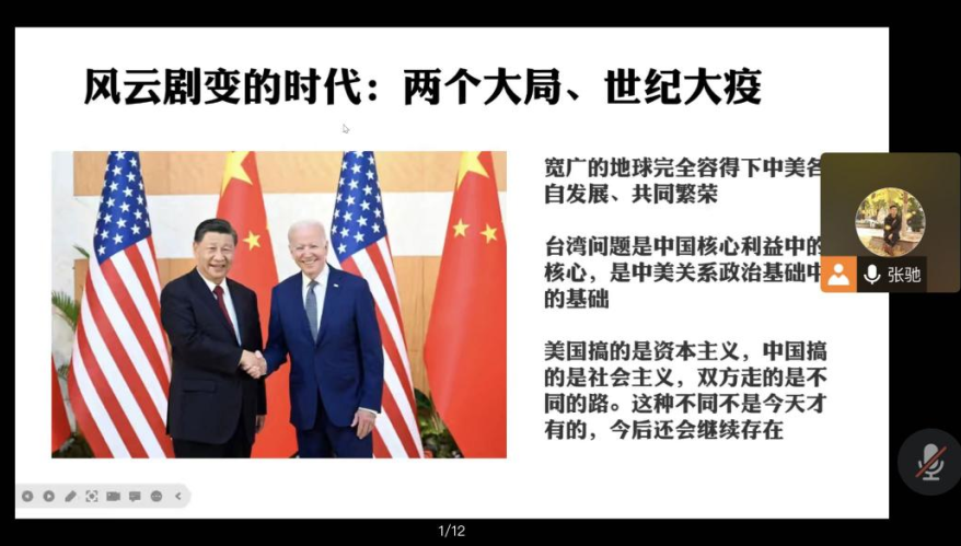 通过这次团课,我对当下的时代与人生规划都有了全新的感悟。老师告诉我们:做不好准备,就会在这个风云剧变的时代愈发被动和“震惊”。大疫当前,我们也应更显大国责任担当,以实际行动向世界传递中国声音,激浊扬清,消除偏见。团课中,老师令我印象深刻的一句话是“要认识到自己的局限——改变了现在也就一并改变了过去和未来,这就是活在当下的意义”,这使我受到了极大的鼓舞。作为青年,抓住了我们拥有的当下,我们也就有了无限的未来。进入大学以来,我深感大学生活并不似想象中的那般轻松,相反,人在成长的过程中生活总是越来越艰难的,我们只有怀抱着坚持奋斗的信念,才能为祖国开辟新的盛世、为自己创造美好未来,才能展现出一名光荣的共青团员的使命和担当。