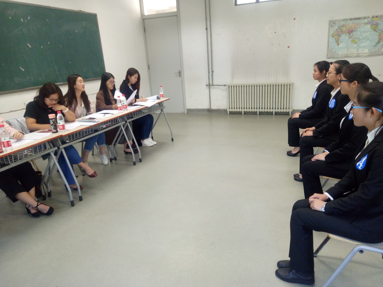 5月3日下午,决赛于学院楼4号楼107教室举行。比赛采取一对多的面试形式,中国康辉旅行社集团有限责任公司副总裁王群祥先生、桔子水晶酒店集团高级经理李思佳女士、信达地产股份有限公司人力资源部副总经理丁辉先生、中财大资产公司人力资源部经理崔本根先生和中央财经大学财政税务学院党委副书记宋立岩老师担任本次比赛评委,学生工作办公室于来老师、团总支书记蒋绮雯老师及财税学院学生们也参加了本次活动。