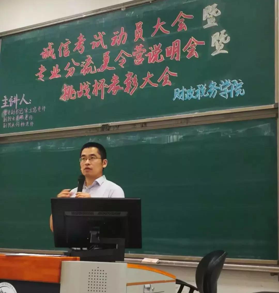 6月13日下午2点,财政税务学院在沙河校区东区主教215教室举行了诚信考试动员大会暨专业分流说明会暨挑战杯表彰大会。本次大会由财政学类17-6班刘逸童同学主持,党委副书记宋立岩老师,副院长肖鹏老师,学生办公室主任、2016级本科生辅导员于来老师,团委副书记、2015级本科生辅导员陈颖老师,2017级本科生辅导员徐燕妮老师参加了本次大会,财政税务学院大一、大二、大三各年级的同学均参与其中。