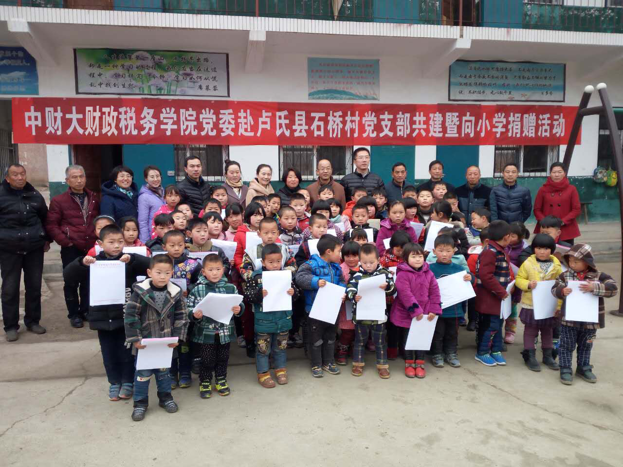 2017年3月23日,财政税务学院党委一行4人赴河南三门峡市文娱乡南石桥村调研,并开展基层党支部共建活动暨爱心捐赠活动。财税学院党委副书记宋立岩、组织员李飞霞、学生工作办公室主任于来、本科生第一党支部书记马江聆参加了此次共建活动。