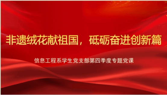 为深入学习贯彻党的二十届三中全会精神,引导我系师生更好地将中华优秀传统文化向创造性转化、创新性发展,进一步增强文化自信,弘扬工匠精神,培育新质生产力,在全面深化改革的伟大征程中挺膺担当。10月24日,信息工程系学生党支部在A502召开“非遗绒花献祖国、砥砺奋进创新篇”专题党课,主讲人为学生党支部书记刘新老师,支部师生及积极分子参与。