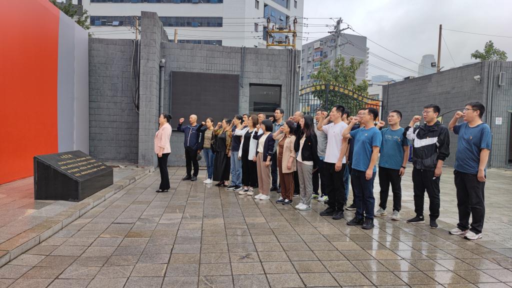 参观结束后,为进一步坚定理想信念,时刻牢记党员身份,不忘入党初心,永葆共产党员本色,全体党员来到宣誓广场。微微细雨中,在庄严的党旗下,党员同志面对鲜红的党旗,举起右拳,用洪亮的声音重温入党誓词,“我志愿加入中国共产党,拥护党的纲领,遵守党的章程,履行党员义务……”。宣誓铿锵有力,用铮铮誓词宣示了对马克思主义的信仰、对共产主义和社会主义的信念以及对党和人民的忠诚,赓续中国共产党人的精神血脉。