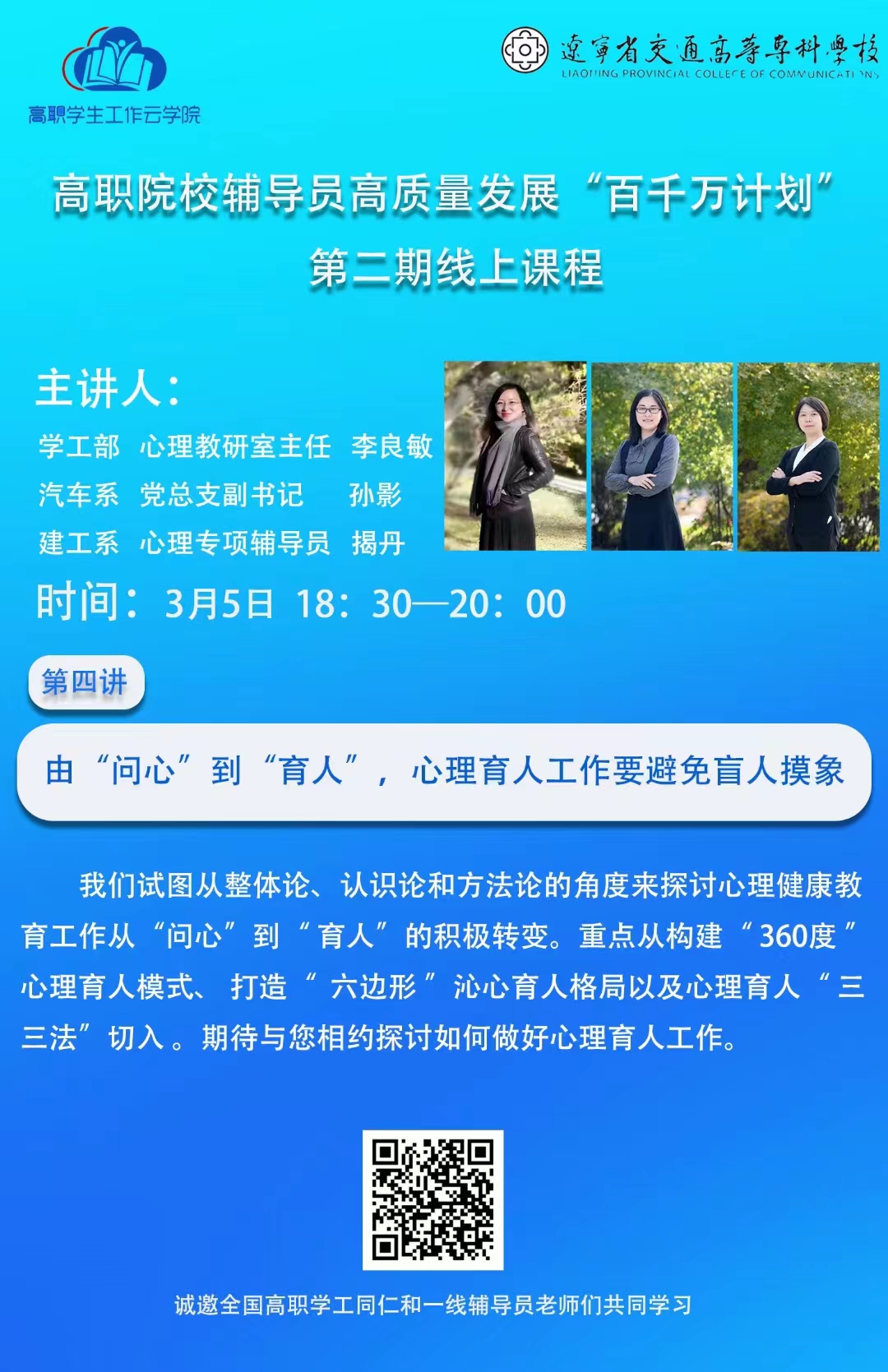 3月5日,学生工作处心理教研室主任李良敏老师、汽车系党总支副书记孙影老师以及建工系辅导员揭丹老师参与全国高职院校辅导员高质量发展“百千万计划”第二期课程讲授。参与此次课程讲授的还有深圳职业技术学院、广州番禺职业技术学院、杭州职业技术学院、贵州交通职业技术学院、陕西工业职业技术学院、日照职业技术学院、顺德职业技术学院7所院校团队。