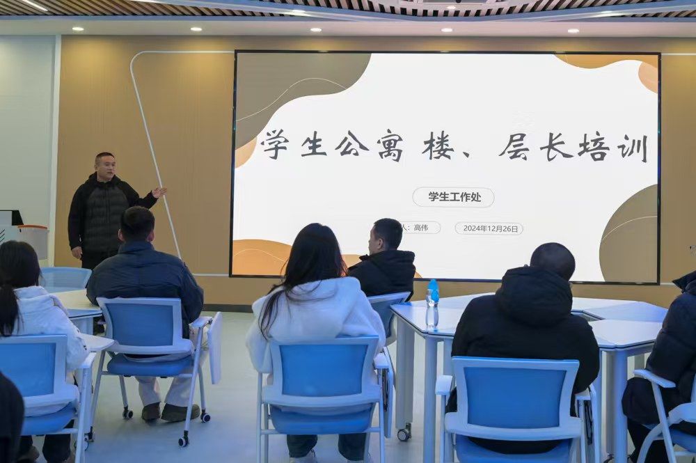 为进一步提升学校学生公寓管理水平,打造更加安全、和谐、有序的学生公寓环境,提升公寓学生干部的管理能力,充分发挥学生干部模范带头作用,畅通公寓管理信息反馈渠道,12月26日,学生工作处在素质教育中心309组织开展学生公寓楼长、层长工作培训。