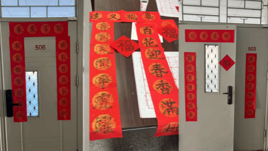 最后,大家纷纷挥毫泼墨,将美好的祝愿凝聚在笔尖,书写出一幅幅寓意深刻的春联。然后同学们将自己书写的春联张贴在老师办公室、学生寝室、还有工作室的门上,它不仅表达了学生对老师一年来辛勤培育的感恩、对寝室同学深深的祝福,更传递了对新一年充满希望与梦想的积极态度。