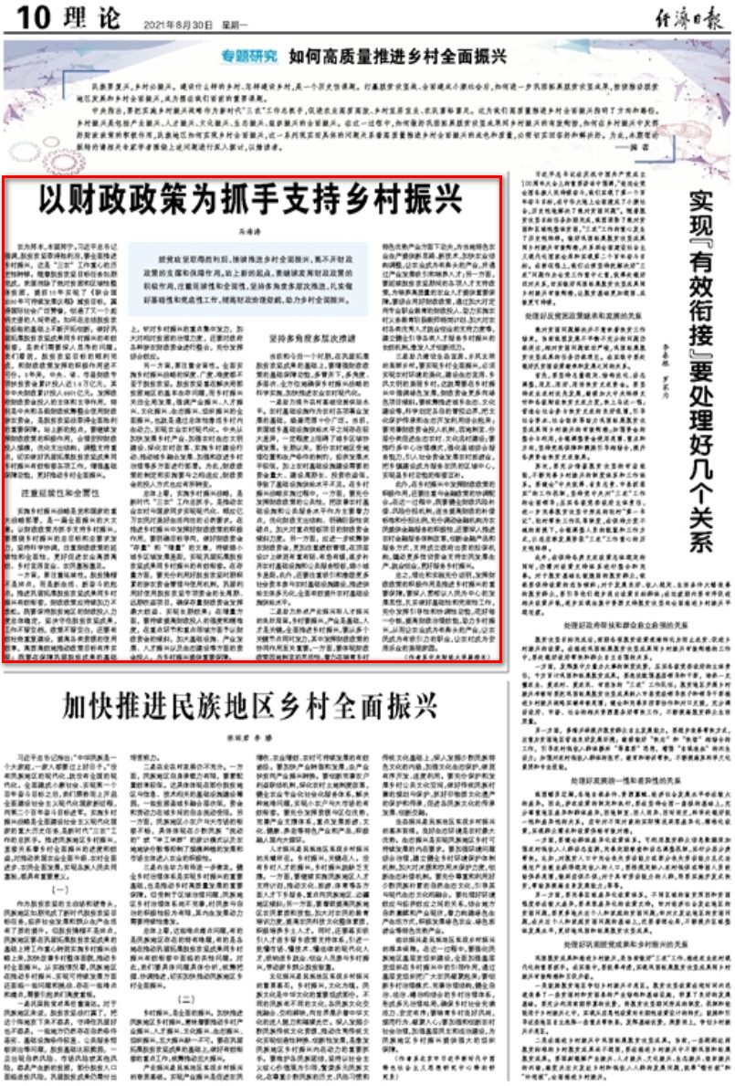 近日,由中央财经大学党委副书记、副校长马海涛教授撰写的文章《以财政政策为抓手支持乡村振兴》于《经济日报》2021年8月30日第10版发表。全文如下: