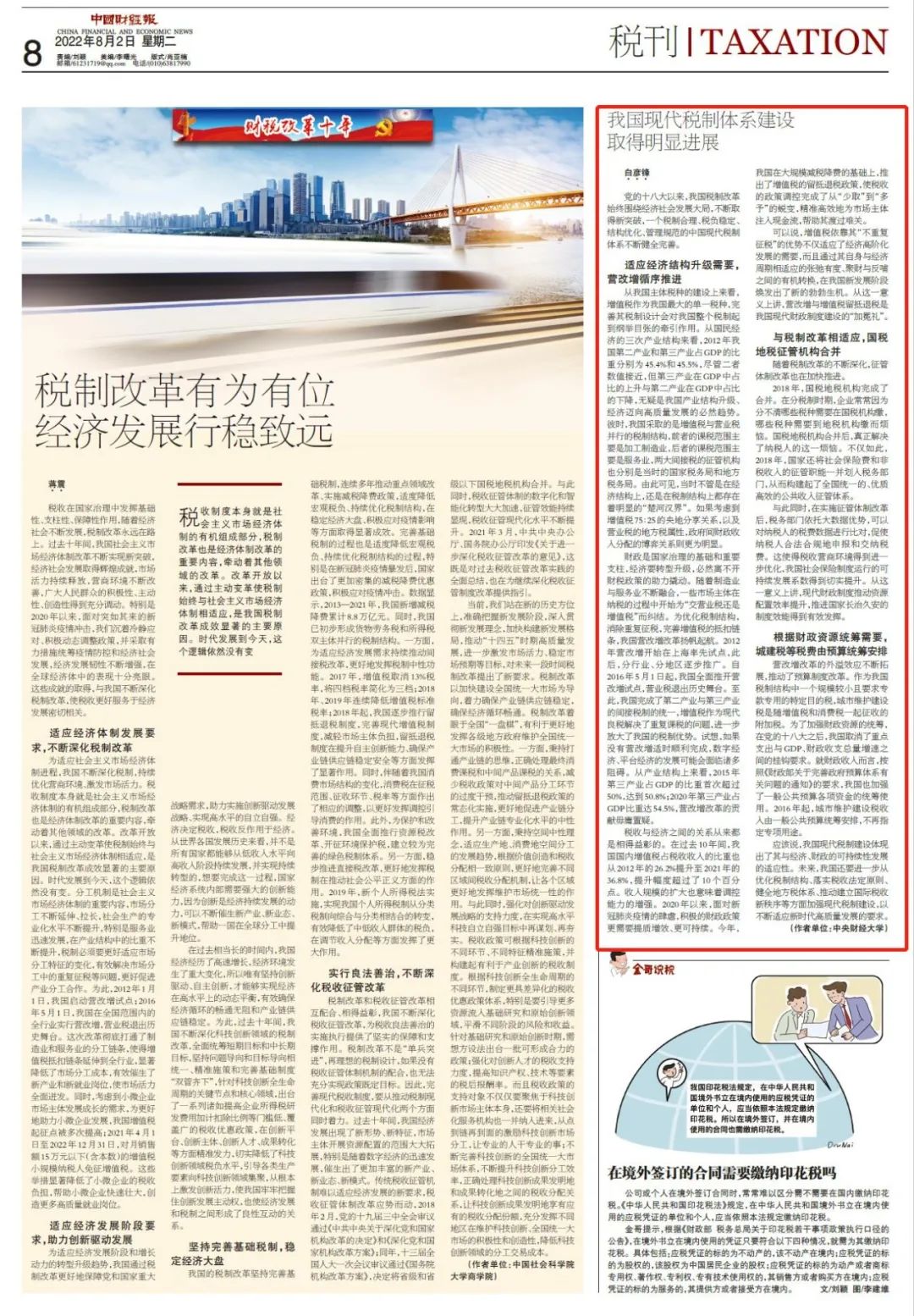 党的十八大以来,我国税制改革始终围绕经济社会发展大局,不断取得新突破,一个税制合理、税负稳定、结构优化、管理规范的中国现代税制体系不断健全完善。