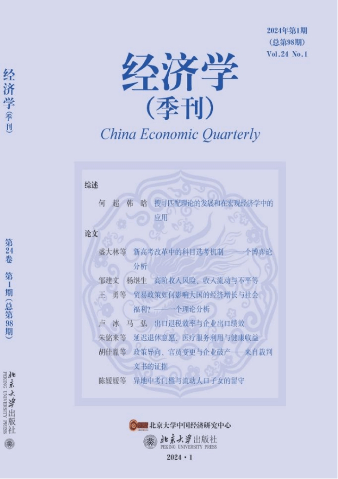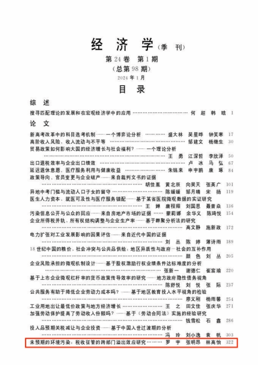 由中央财经大学财政税务学院副教授张明昂、博士研究生罗宇与广东外语外贸大学林高怡合作撰写的论文《未预期的环境污染:税收征管的跨部门溢出效应研究》刊发于中文AA类期刊《经济学(季刊)》2024年第1期。以下为文章主要内容。