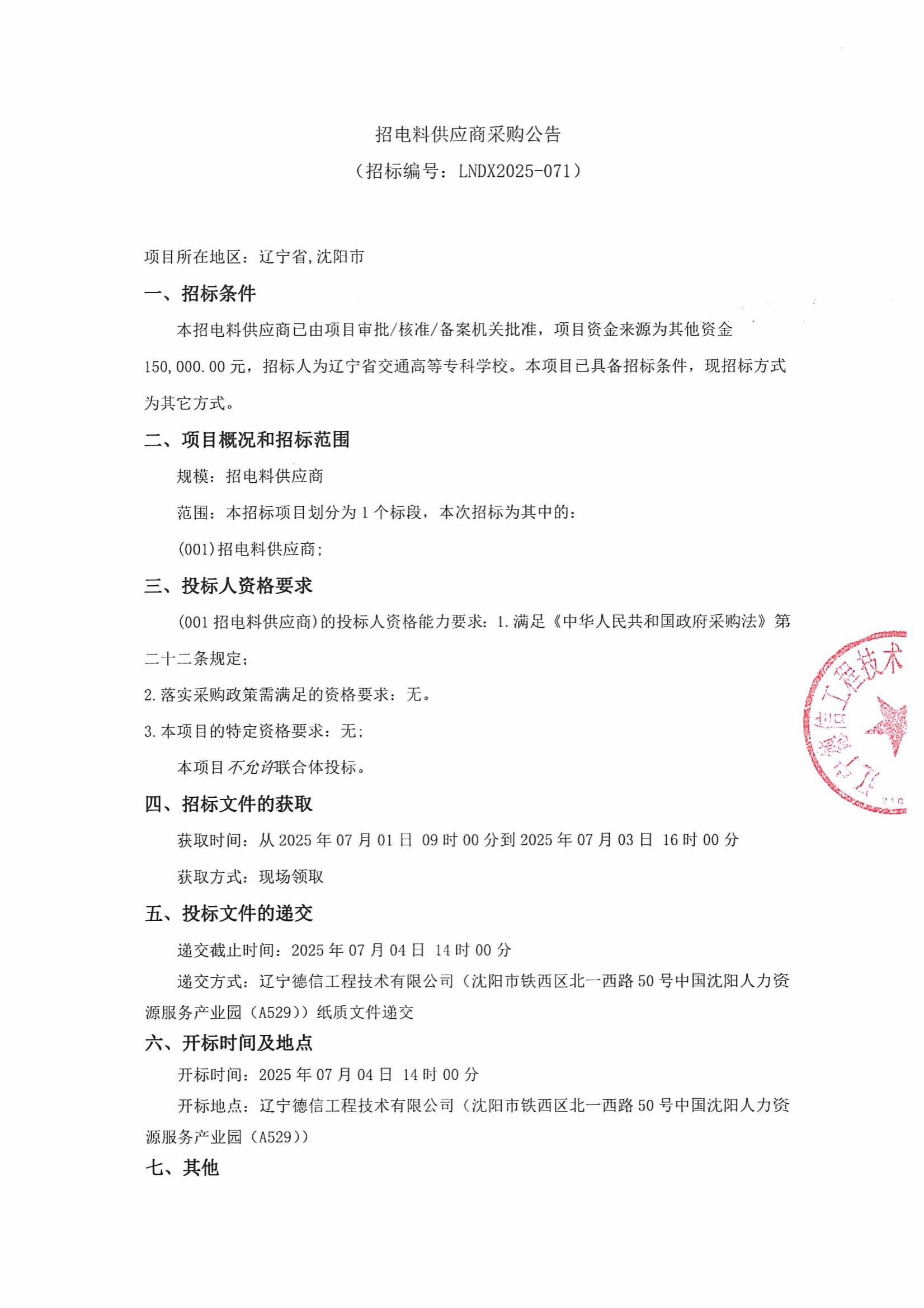 辽宁省交通高等专科学校招电料供应商采购公告(LNCC2025050)