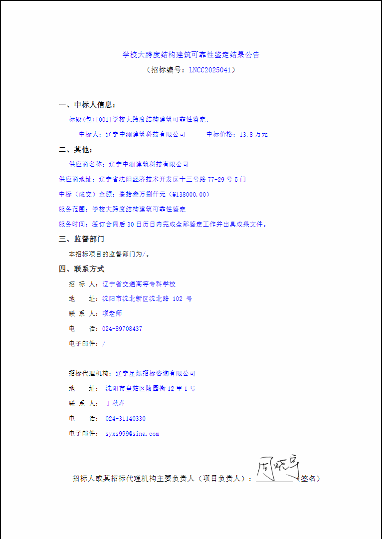 辽宁省交通高等专科学校学生公寓空调系统配套电力增容工程结果公告