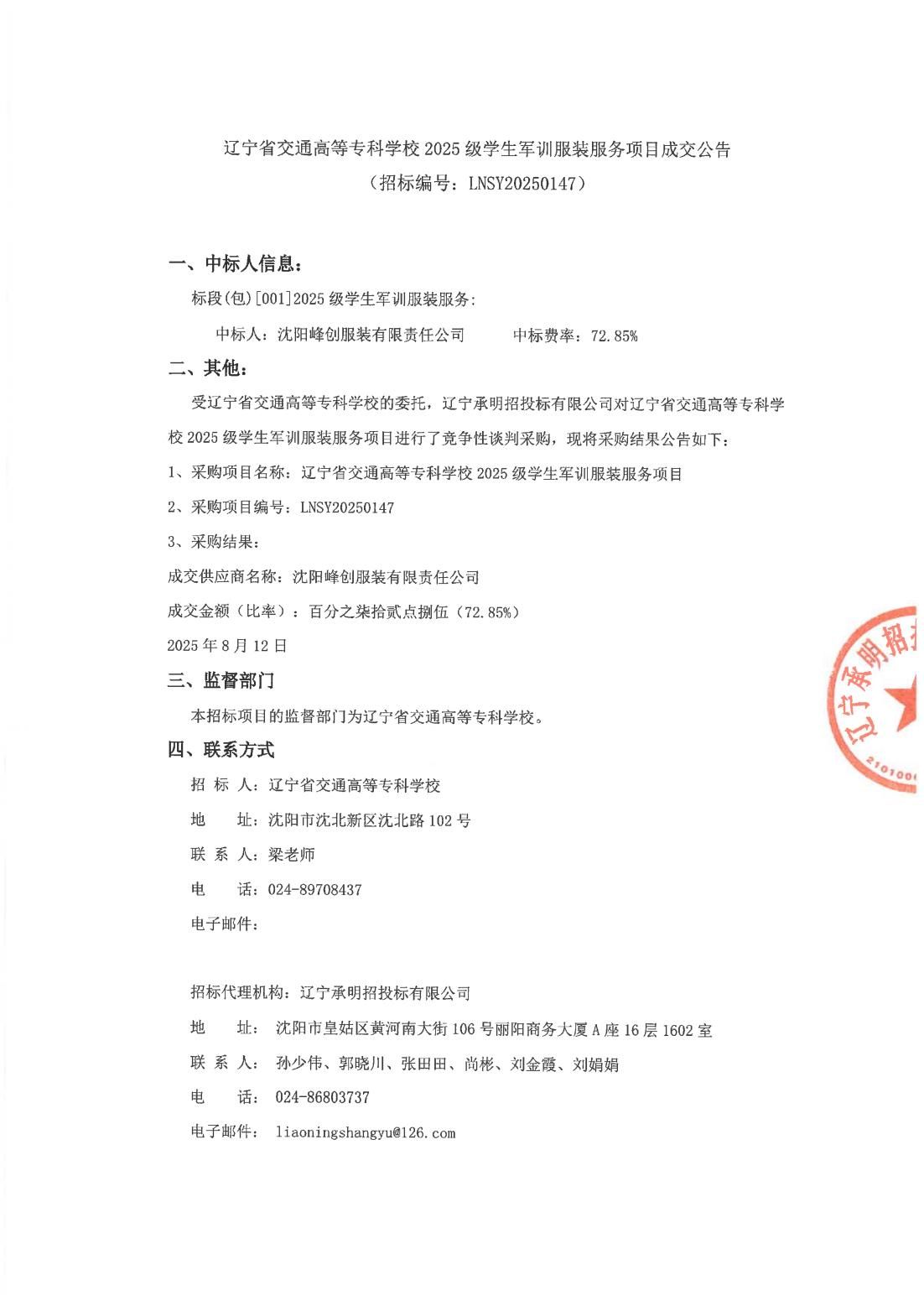2025级学生军训服装服务项目结果公告(LNCC2025076)