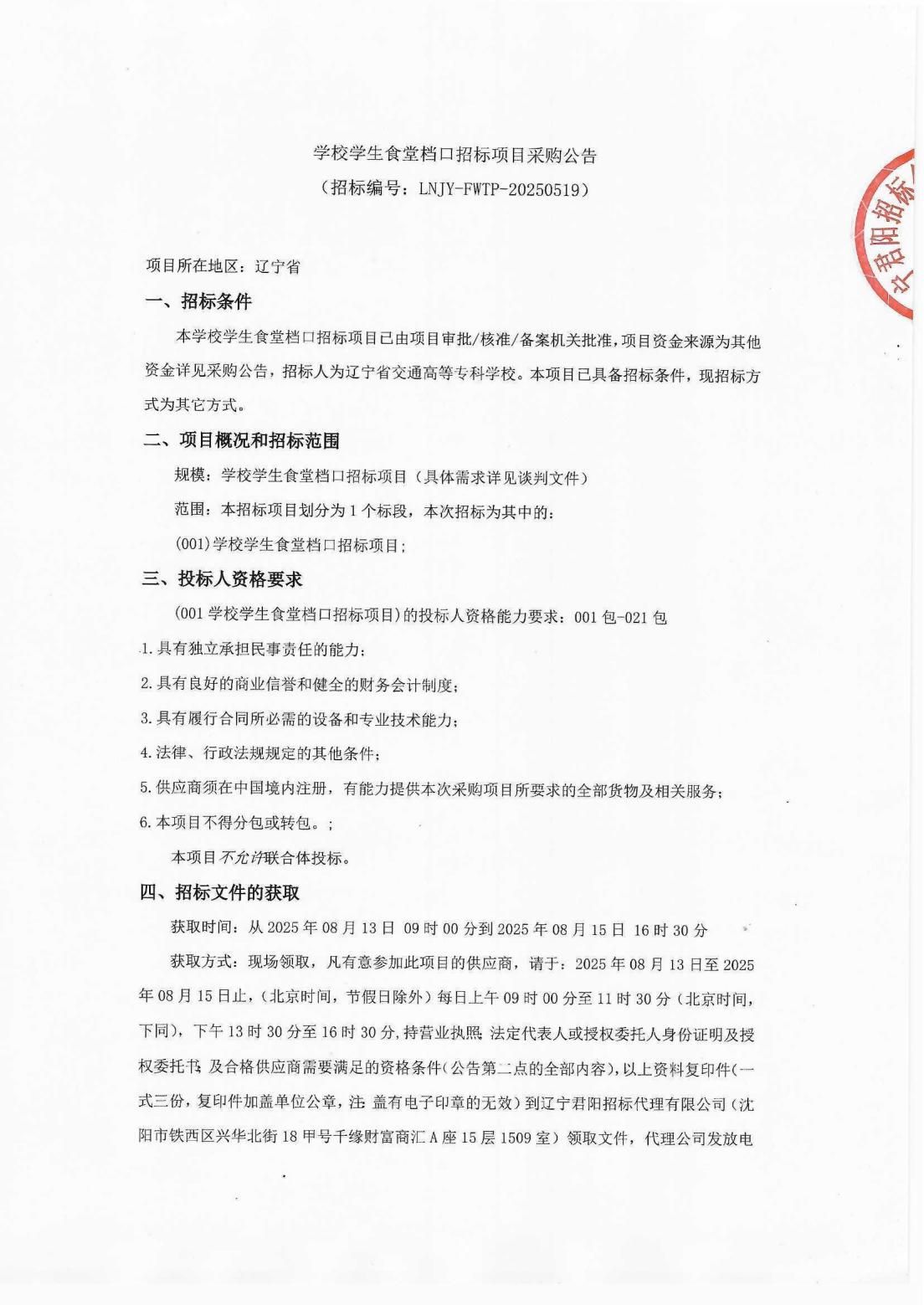 学校学生食堂档口招标项目采购公告(LNCC2025017)